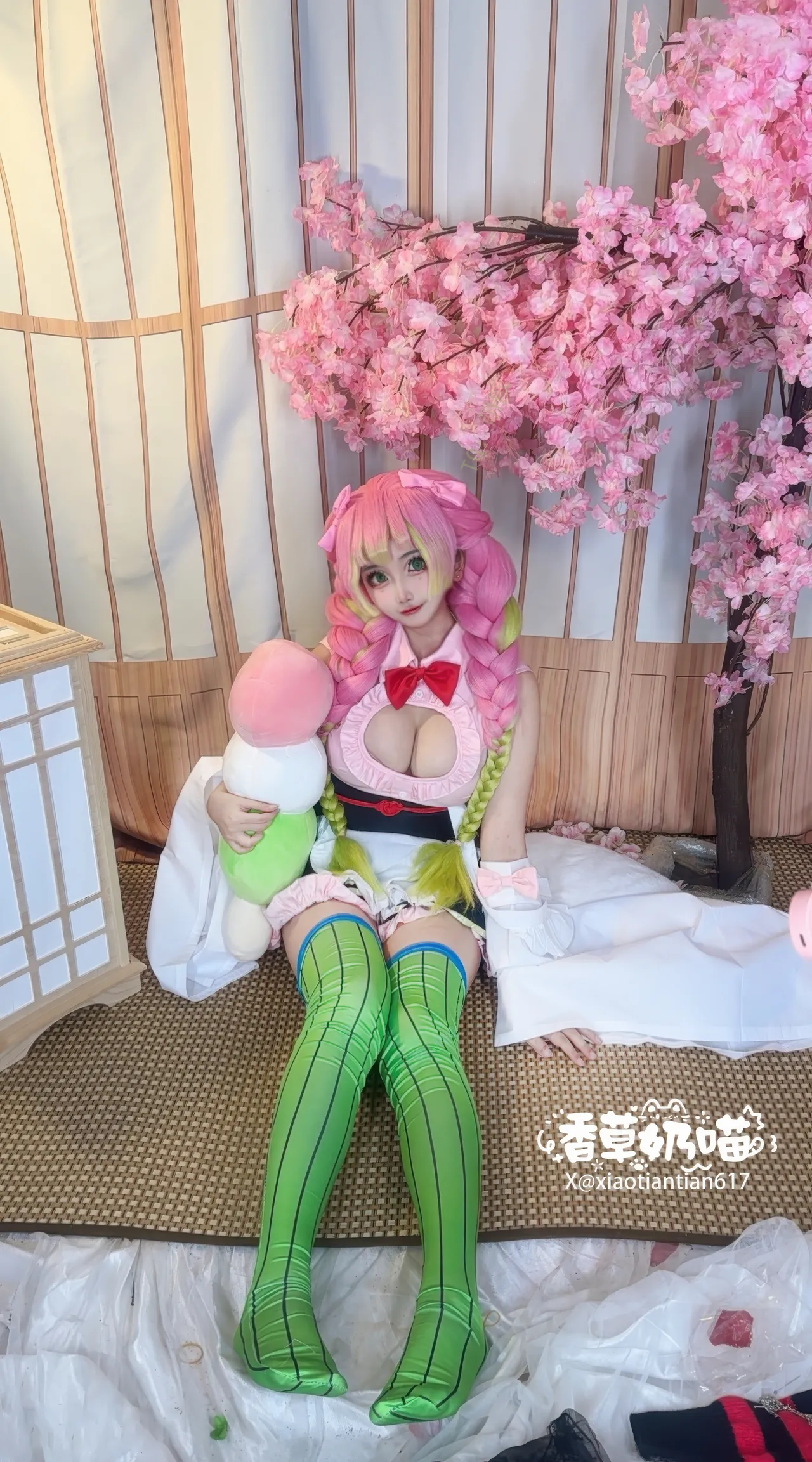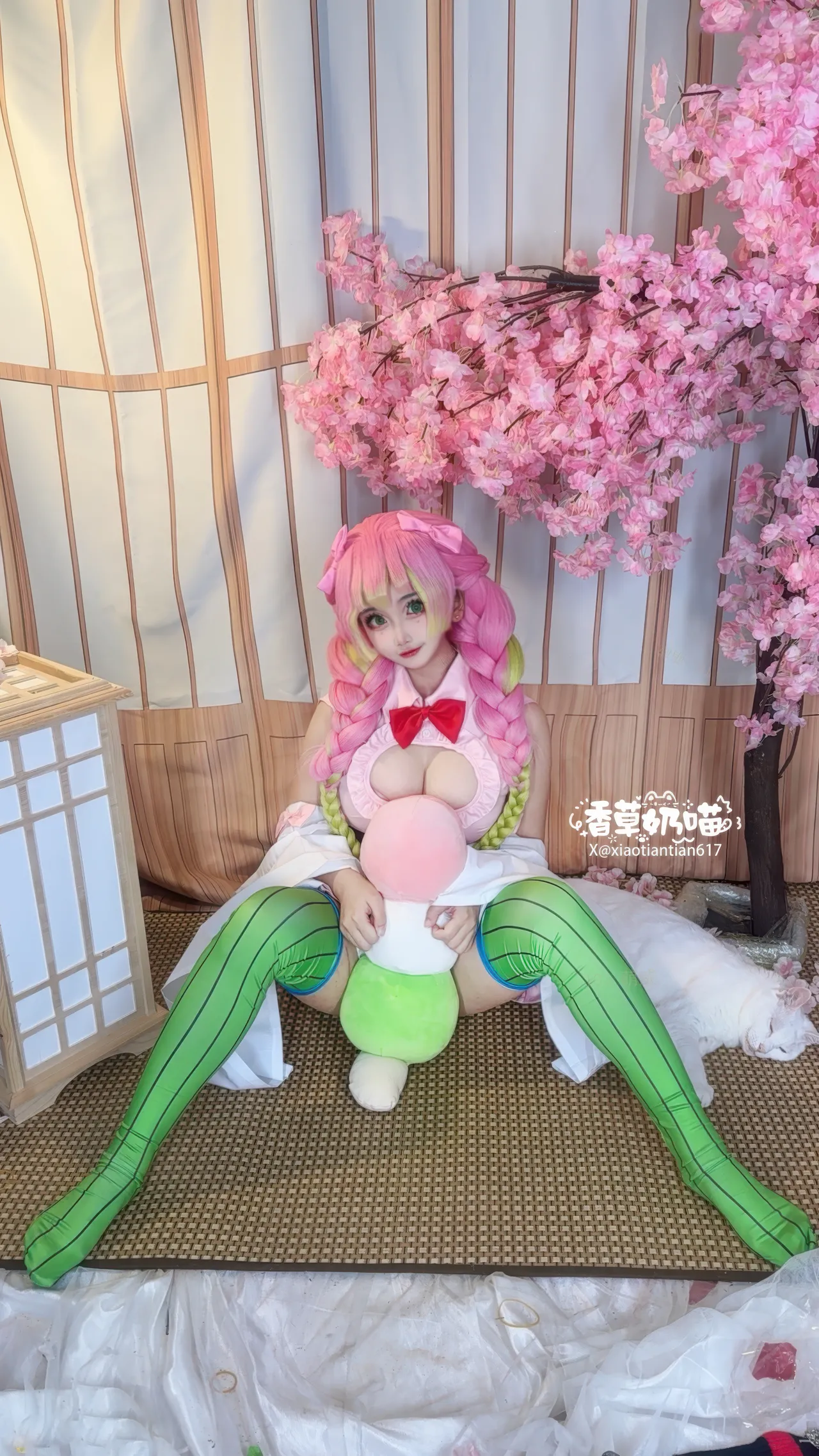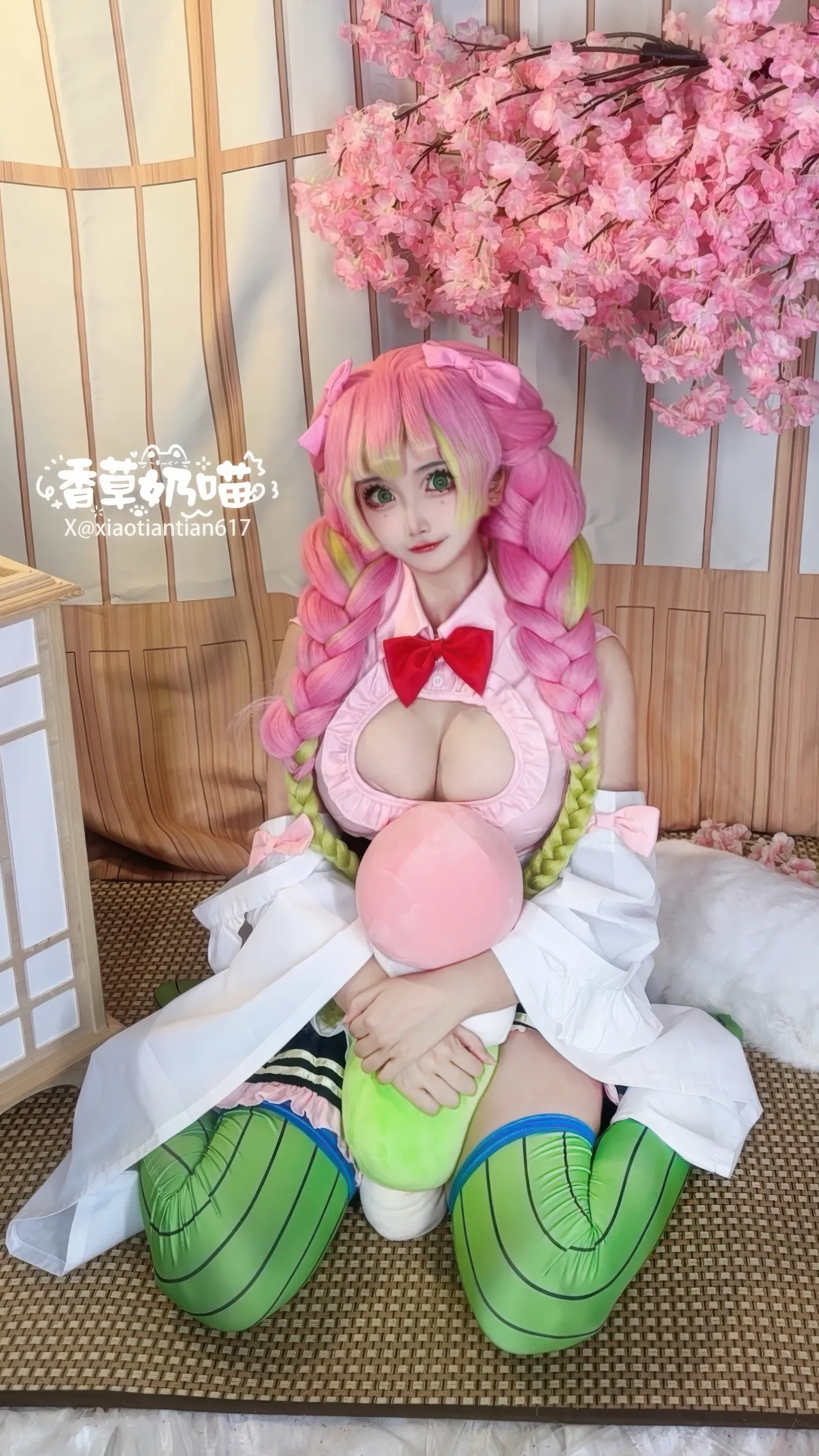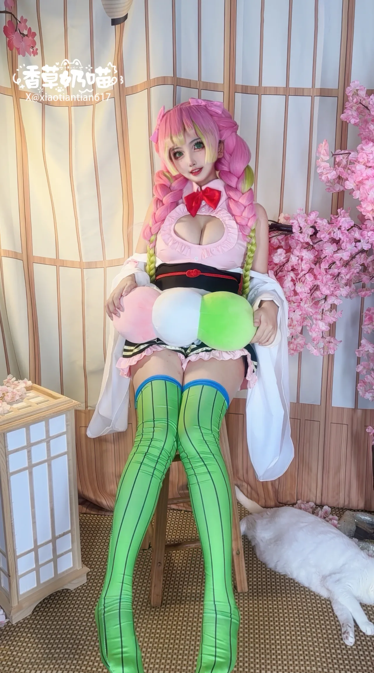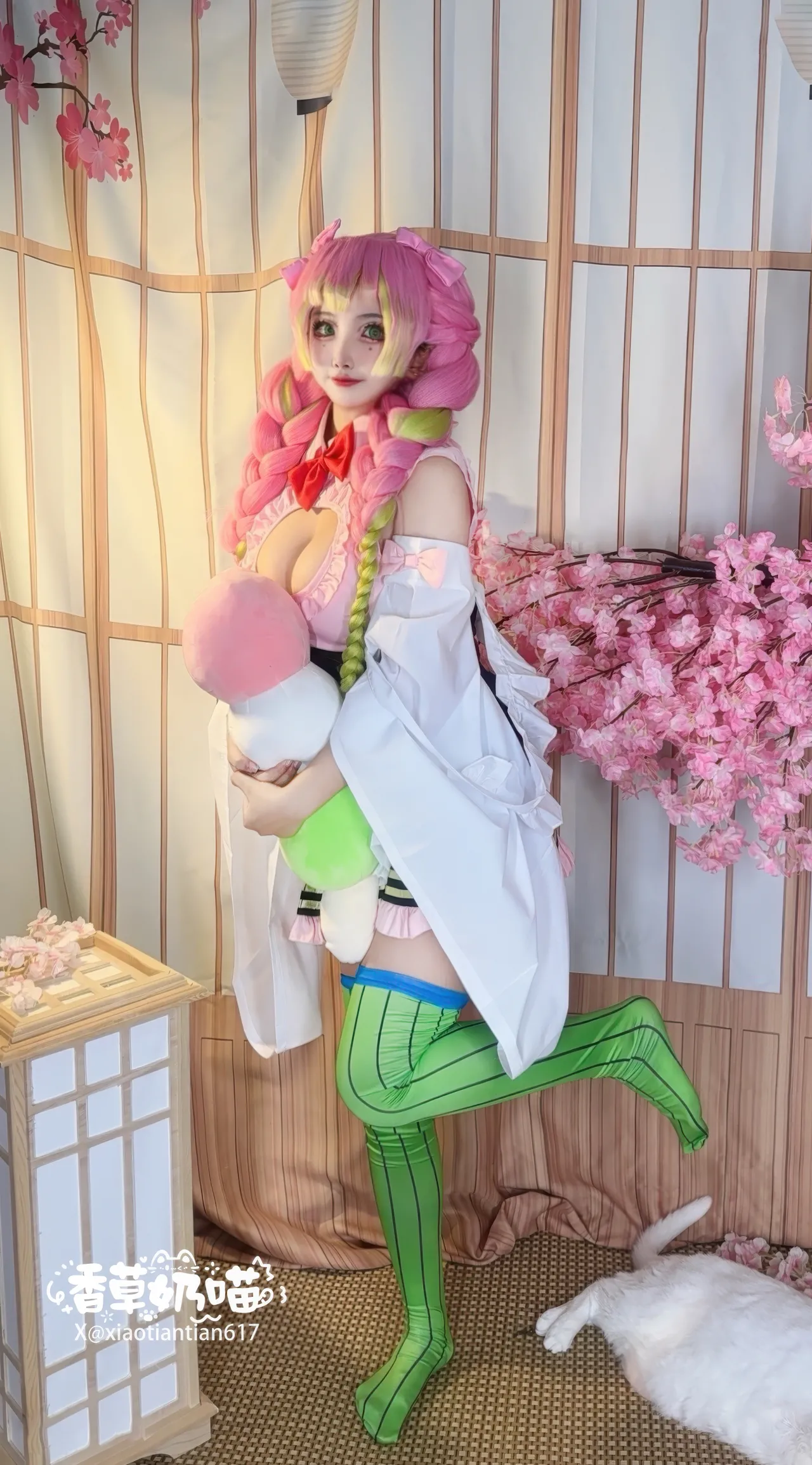 Tags: big breasts, hentai cosplay, kimetsu no yaiba | demon slayer, Makeup, Mitsuri Kanroji, sole female, stockings, twintails, very long hair