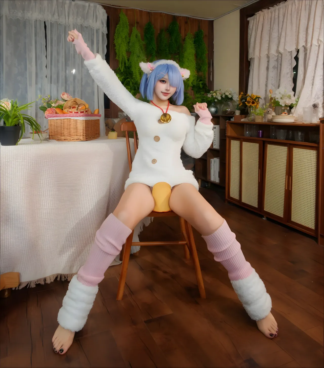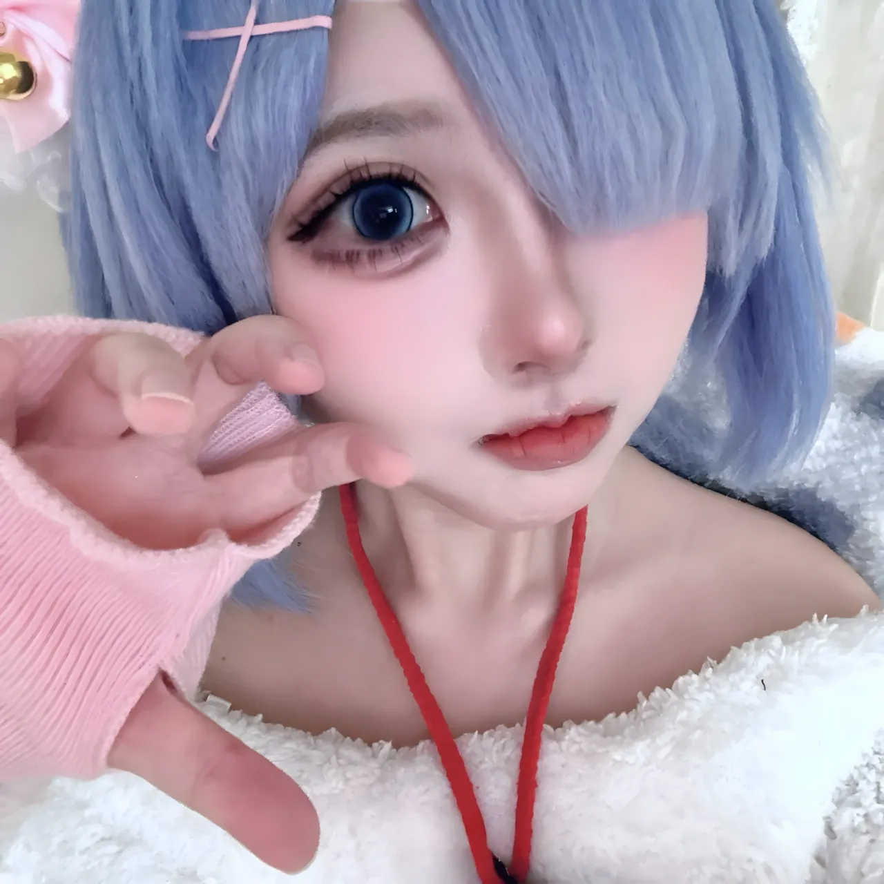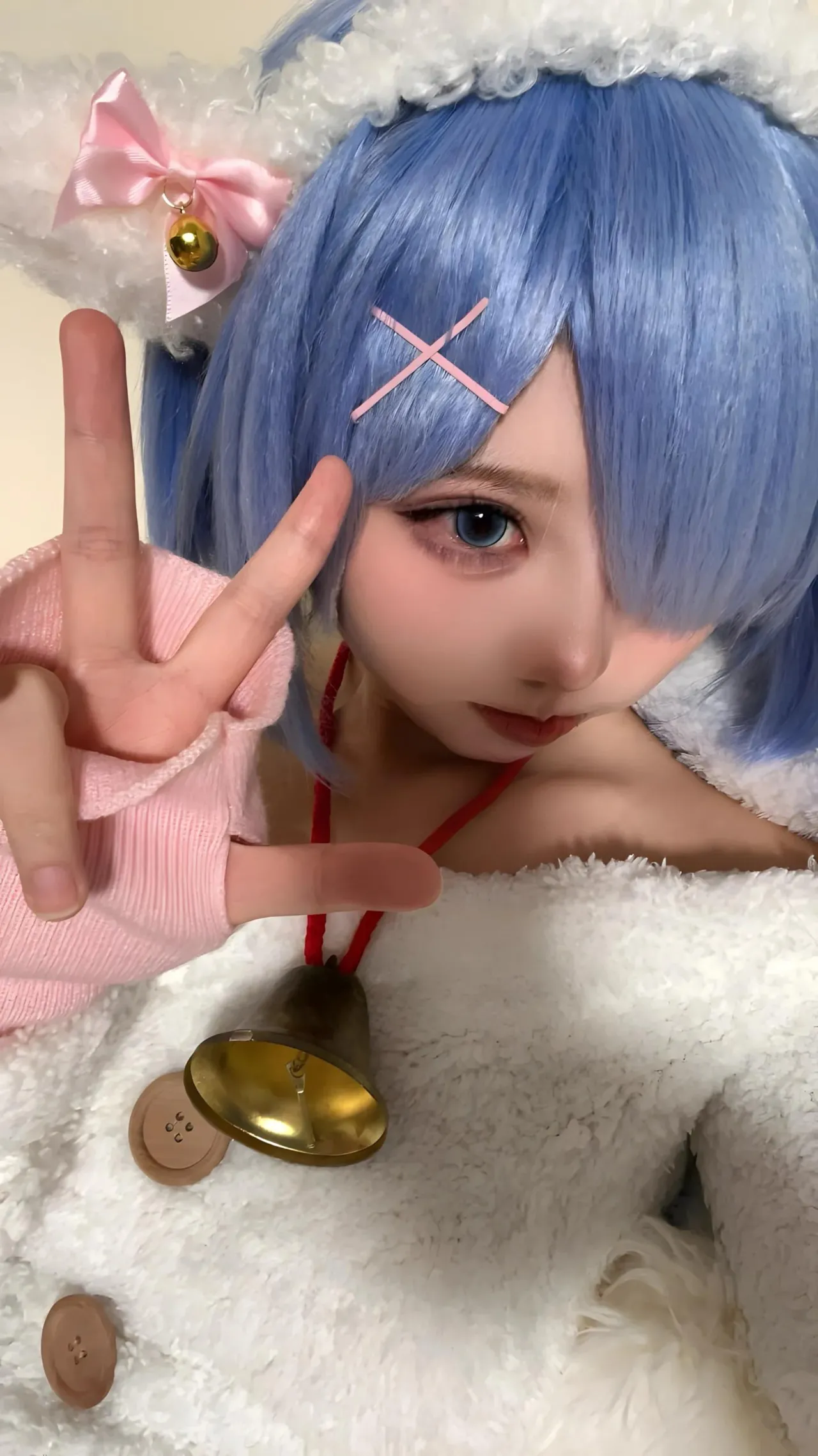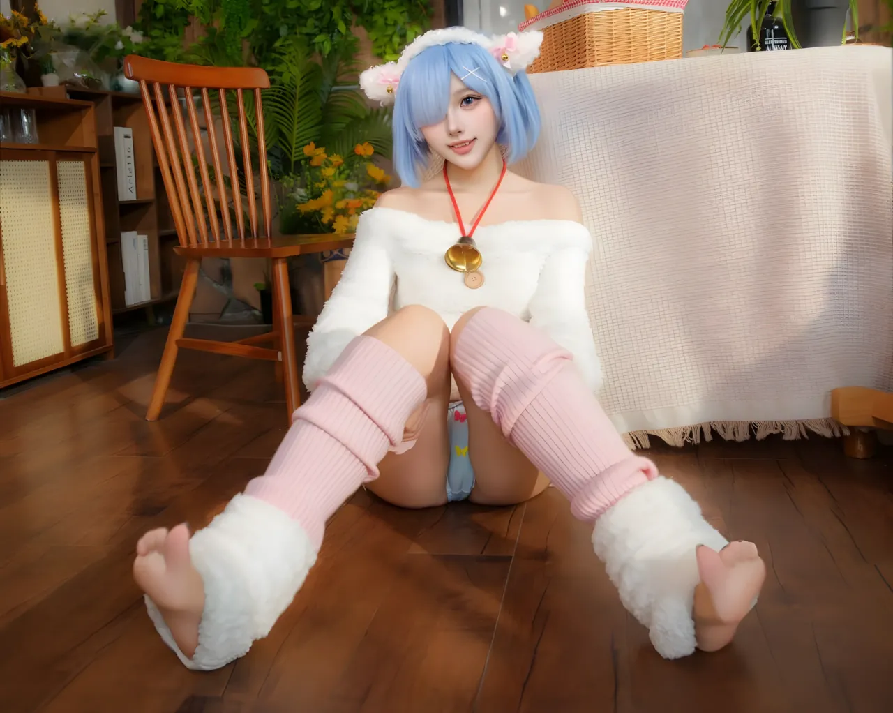Tags: bandaid, collar, eye-covering bang, gloves, hentai cosplay, Kemonomimi, Makeup, painted nails, pasties, re zero kara hajimeru isekai seikatsu, Rem, sheep girl
