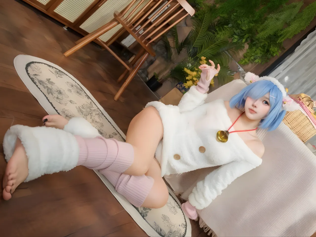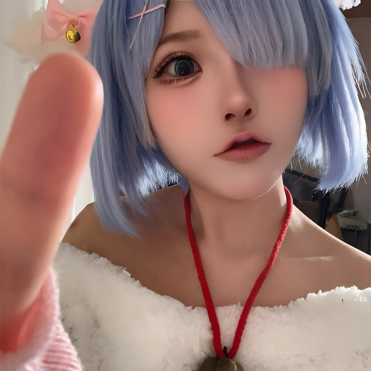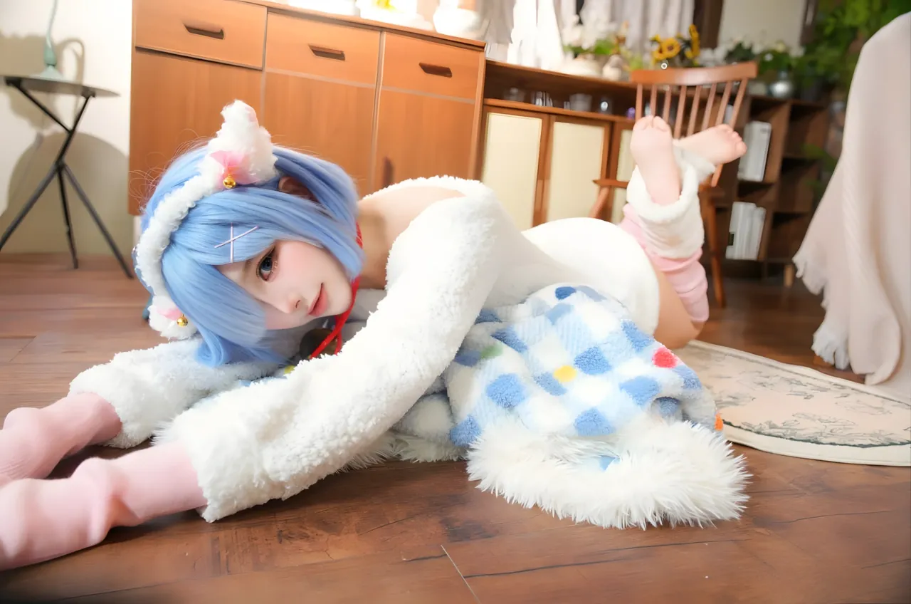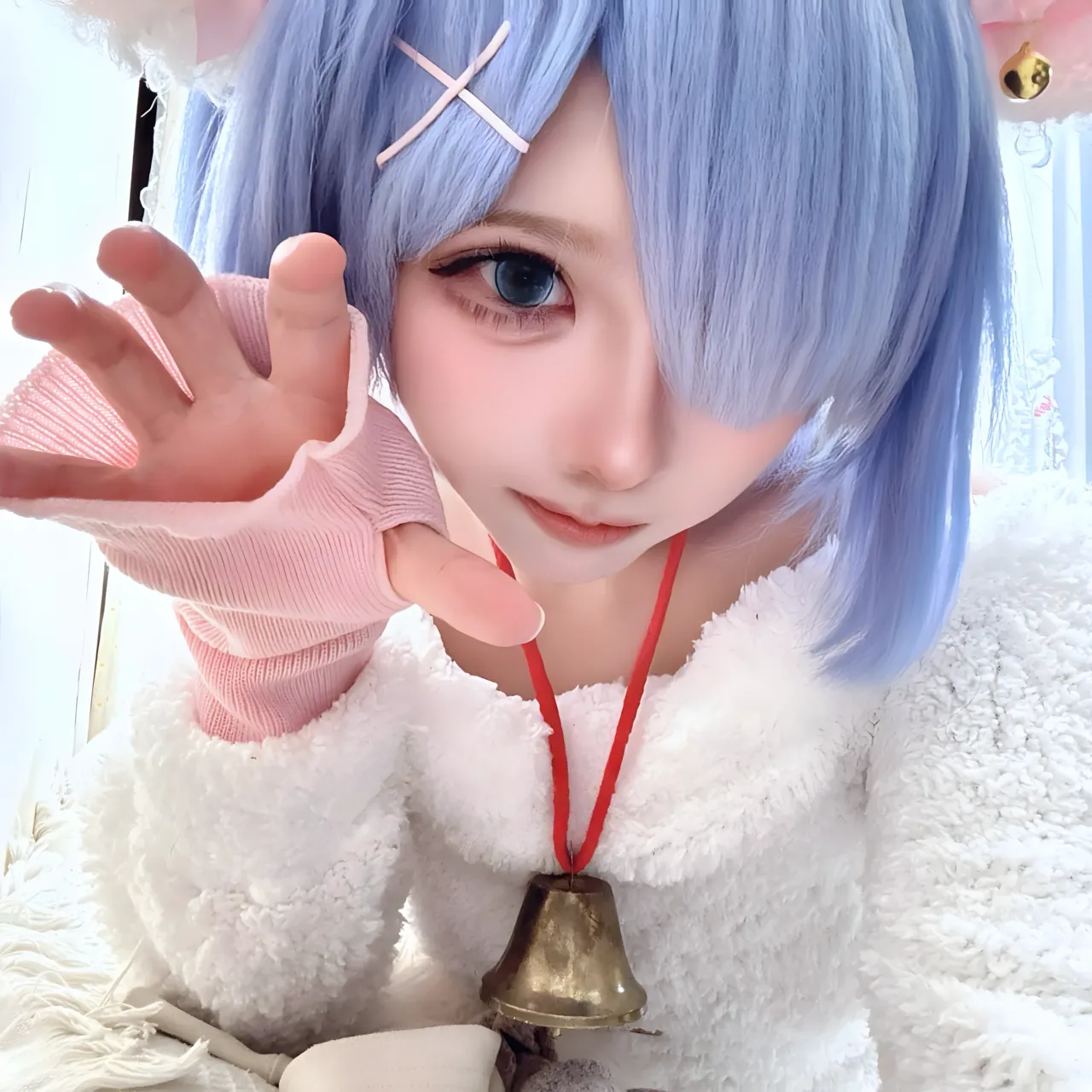 Tags: bandaid, collar, eye-covering bang, gloves, hentai cosplay, Kemonomimi, Makeup, painted nails, pasties, re zero kara hajimeru isekai seikatsu, Rem, sheep girl