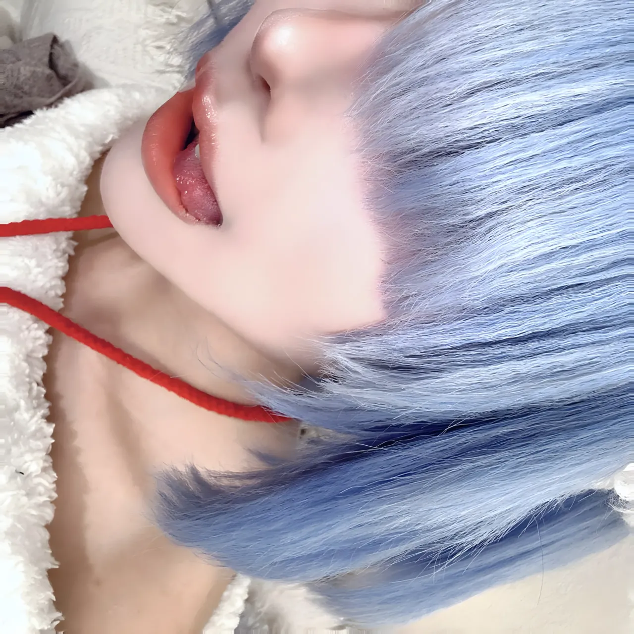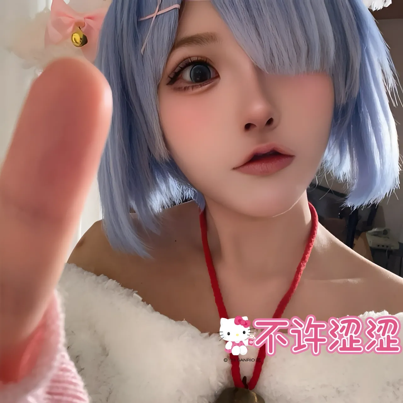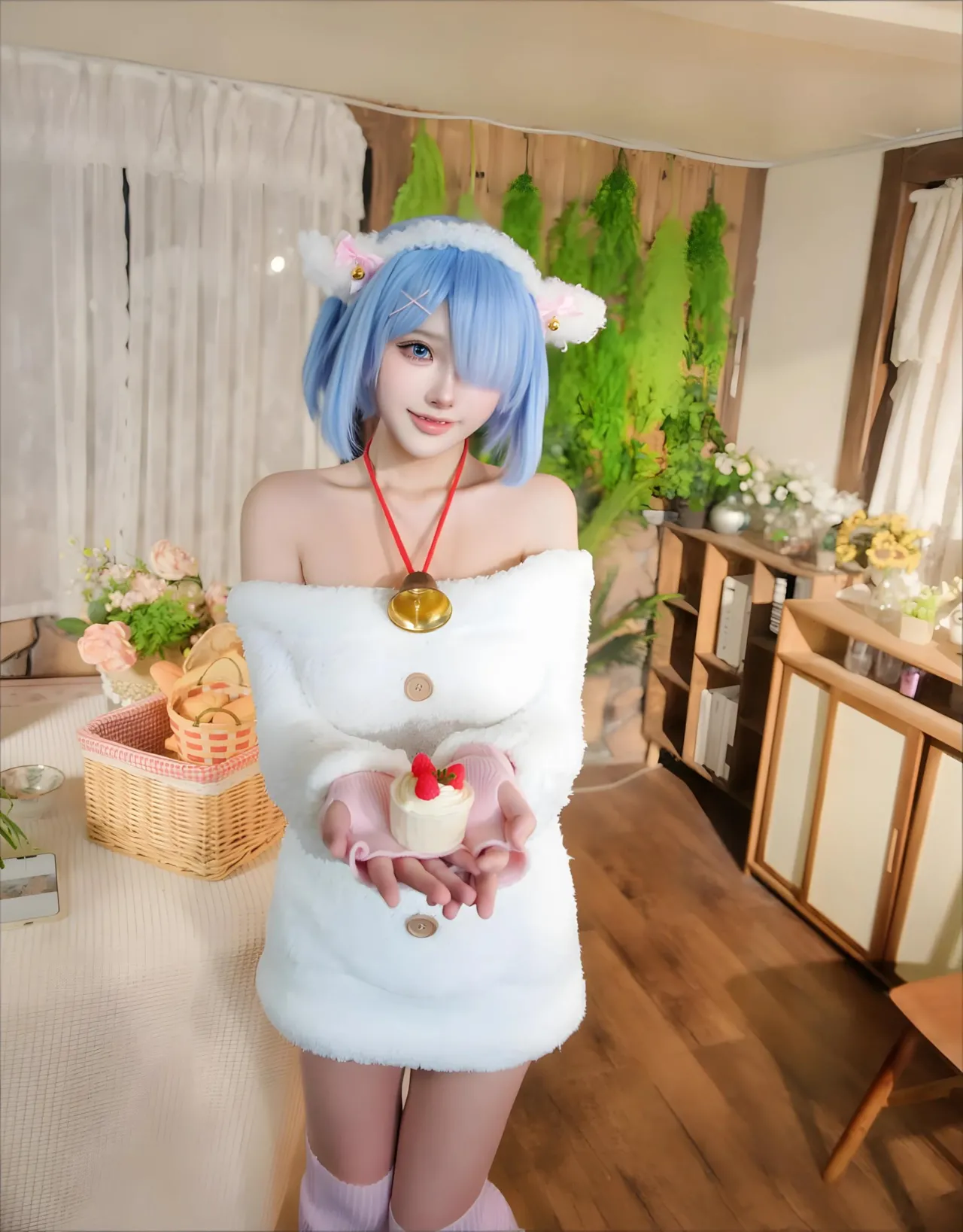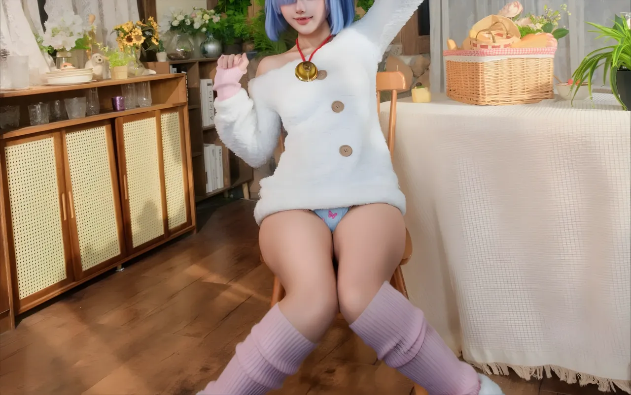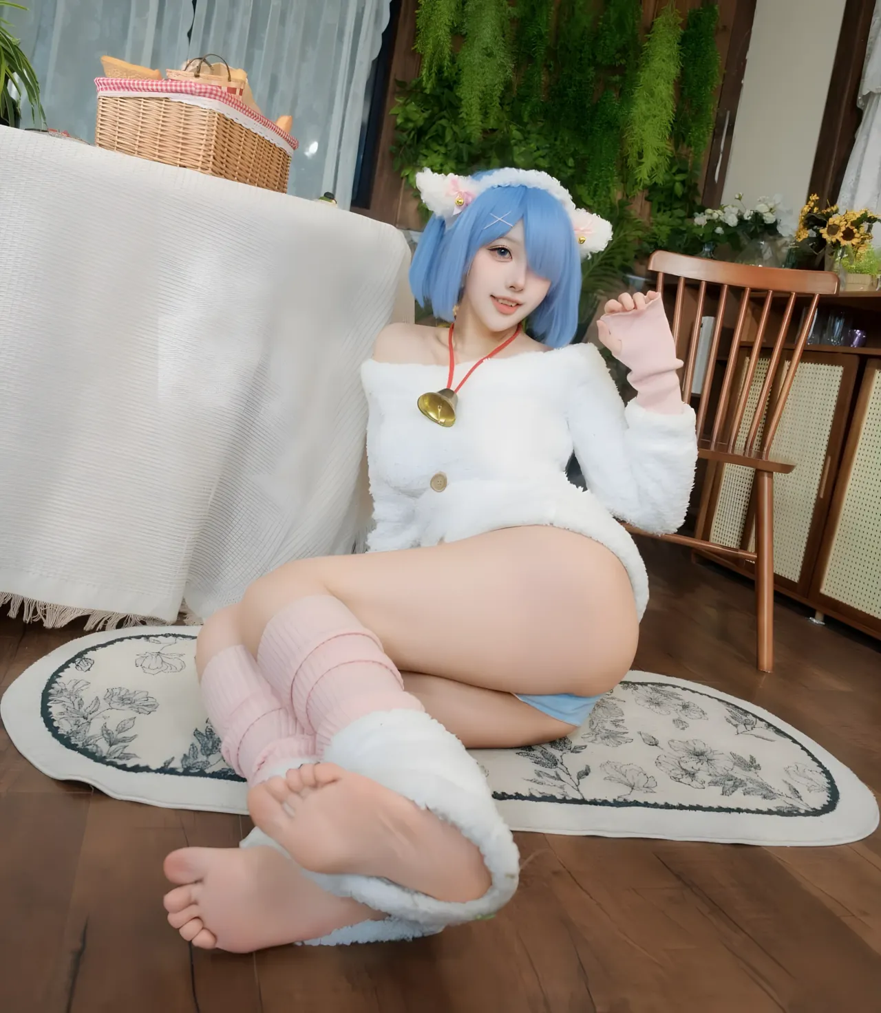 Tags: bandaid, collar, eye-covering bang, gloves, hentai cosplay, Kemonomimi, Makeup, painted nails, pasties, re zero kara hajimeru isekai seikatsu, Rem, sheep girl