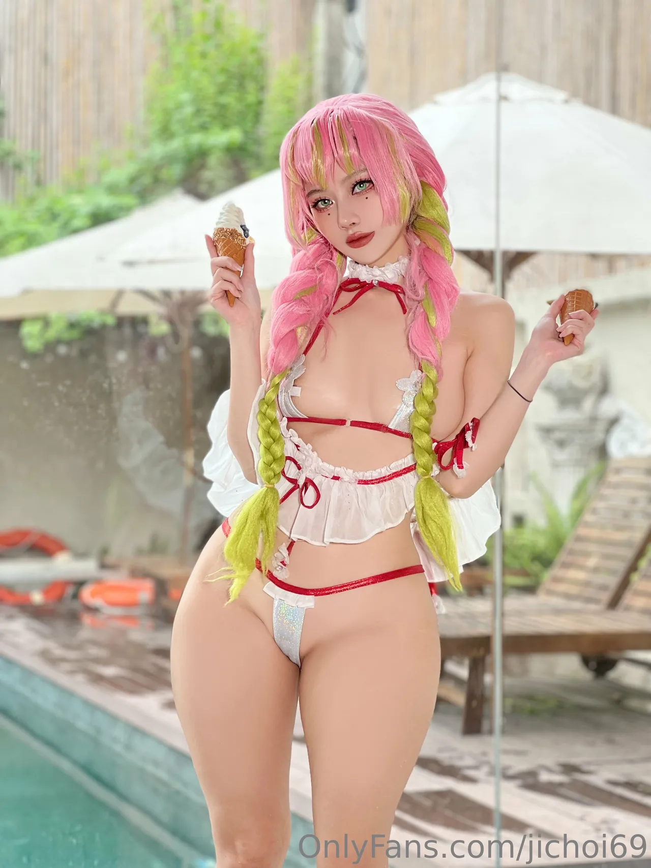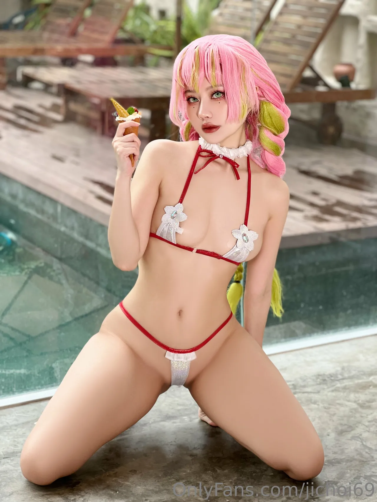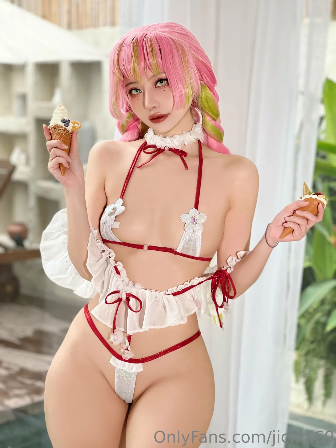 Tags: Bikini, collar, hentai cosplay, kimetsu no yaiba | demon slayer, Makeup, Mitsuri Kanroji, swimsuit, very long hair