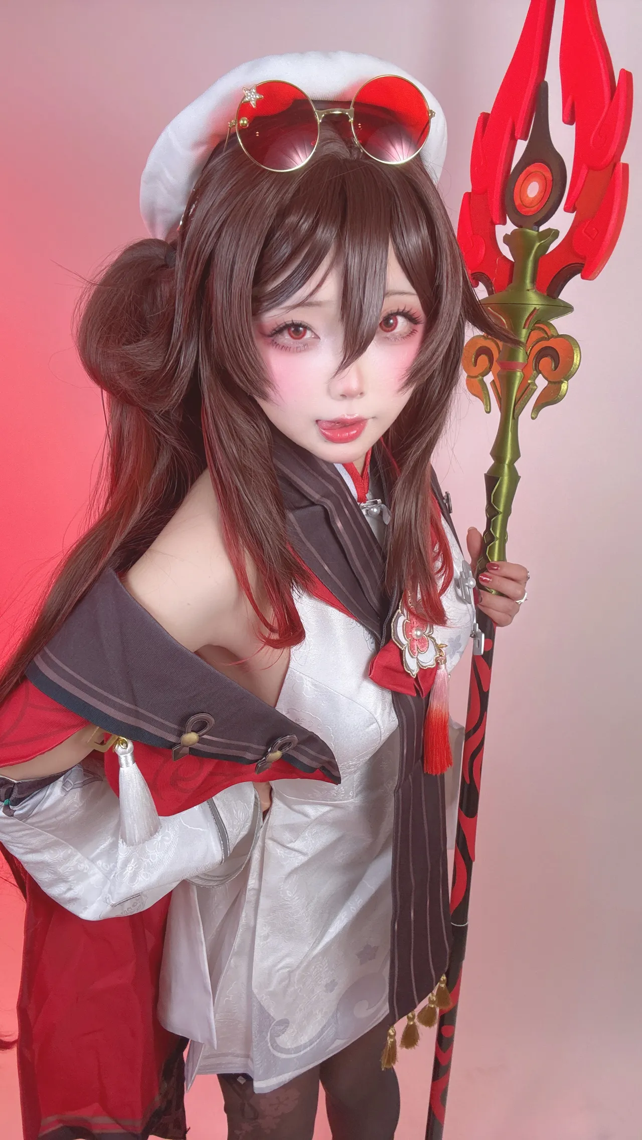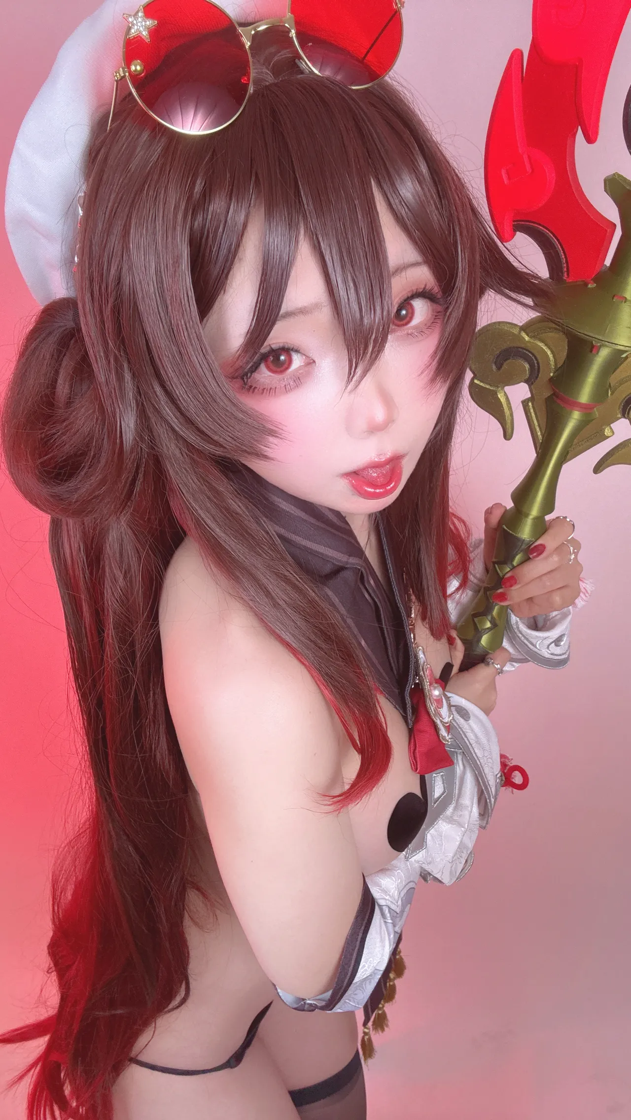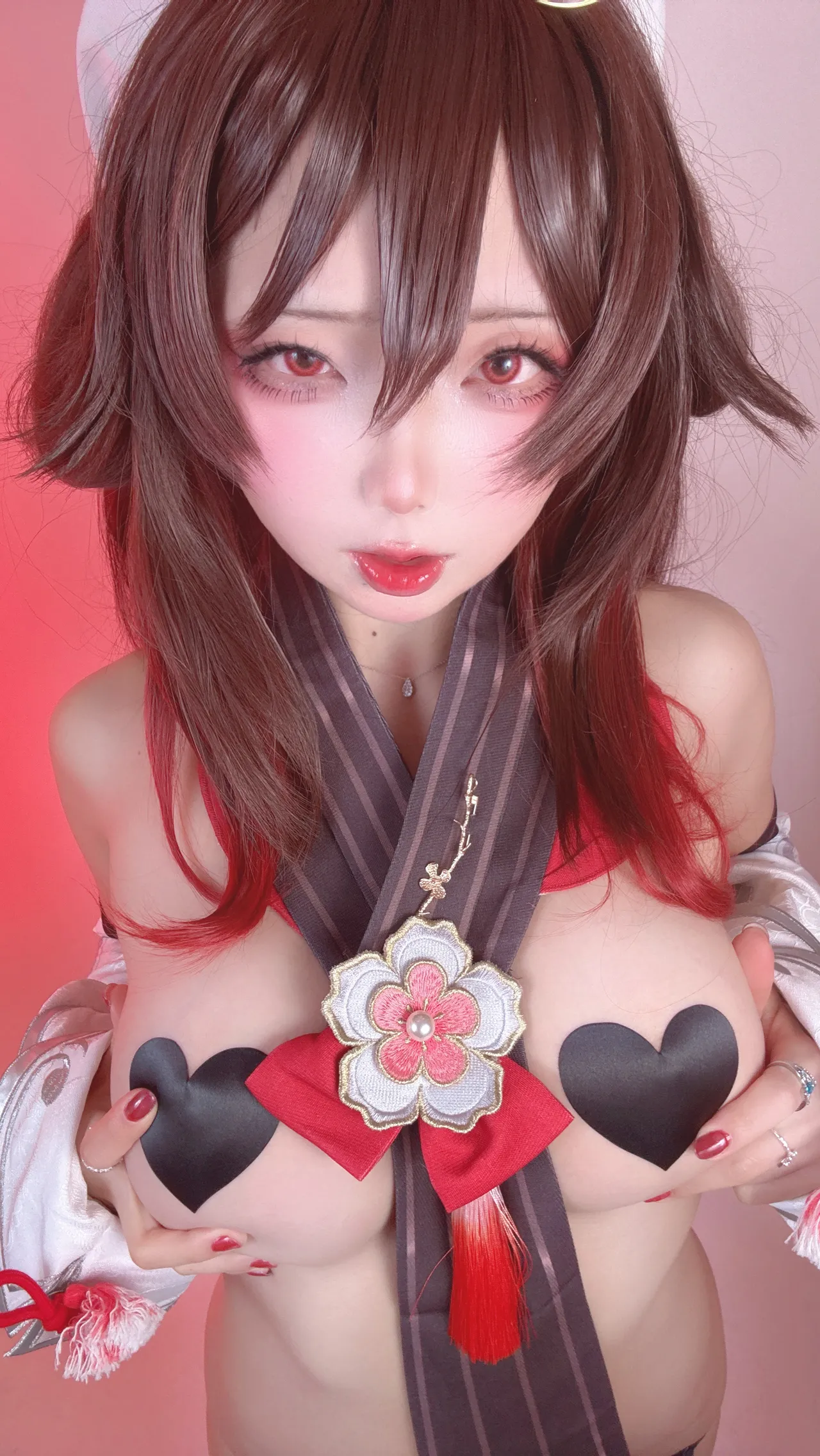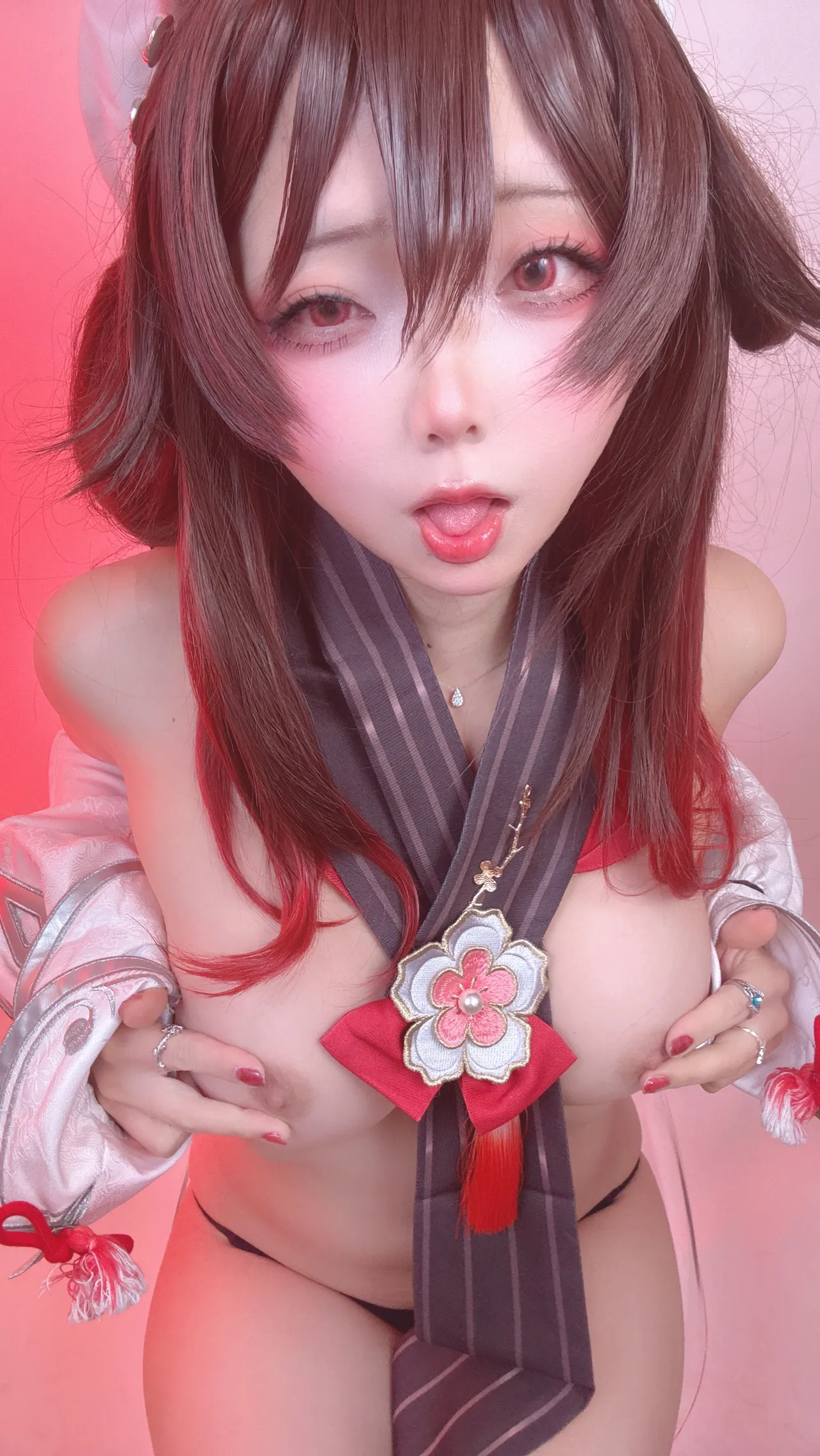 Tags: Ahegao, detached sleeves, Genshin Impact, hentai cosplay, hu tao, Makeup, pasties, stockings, very long hair