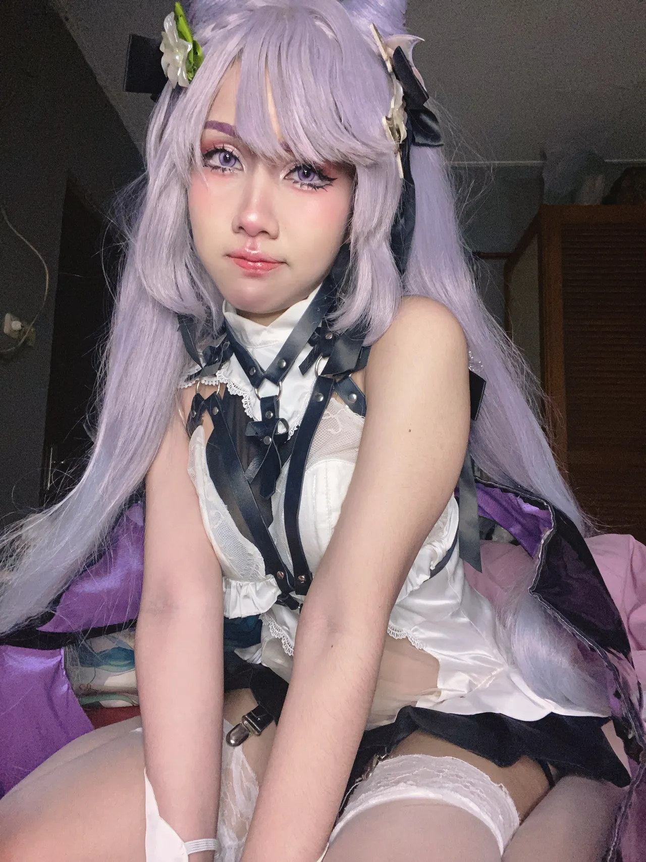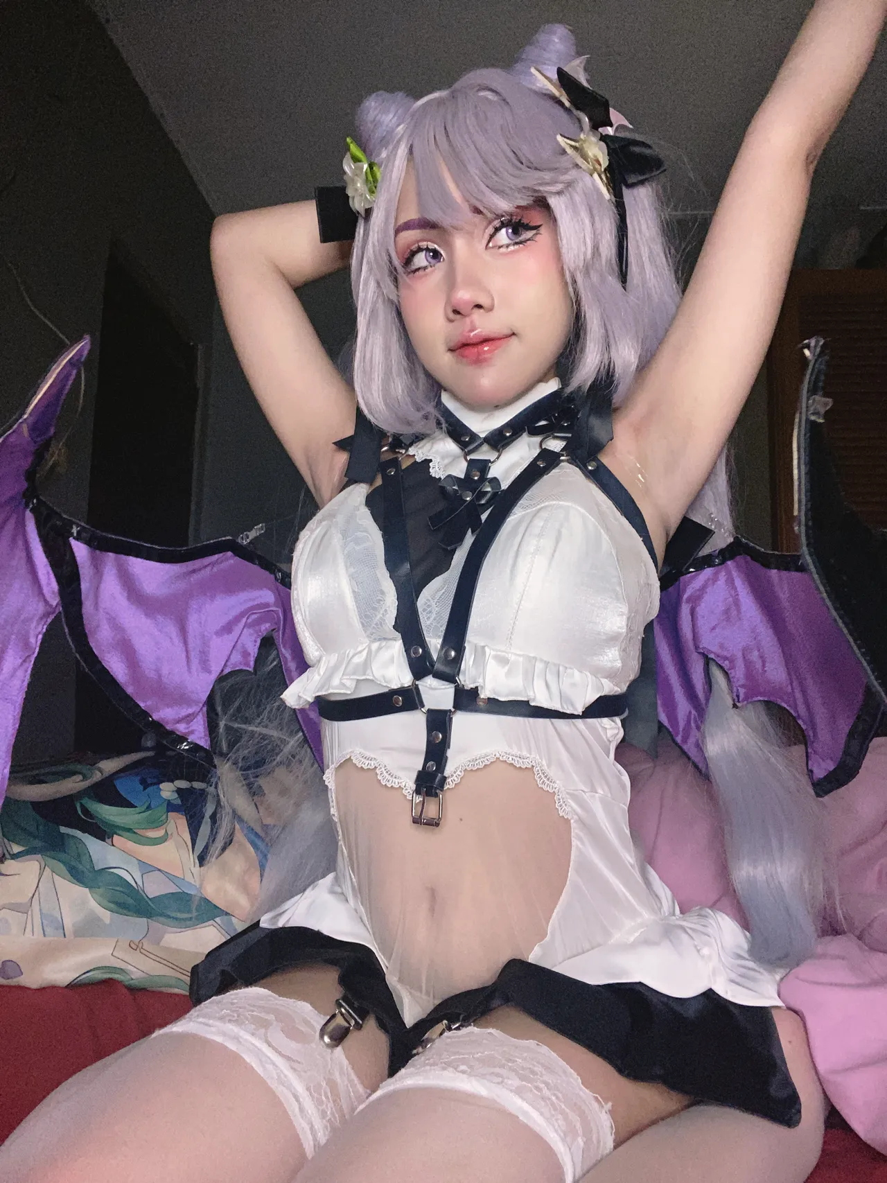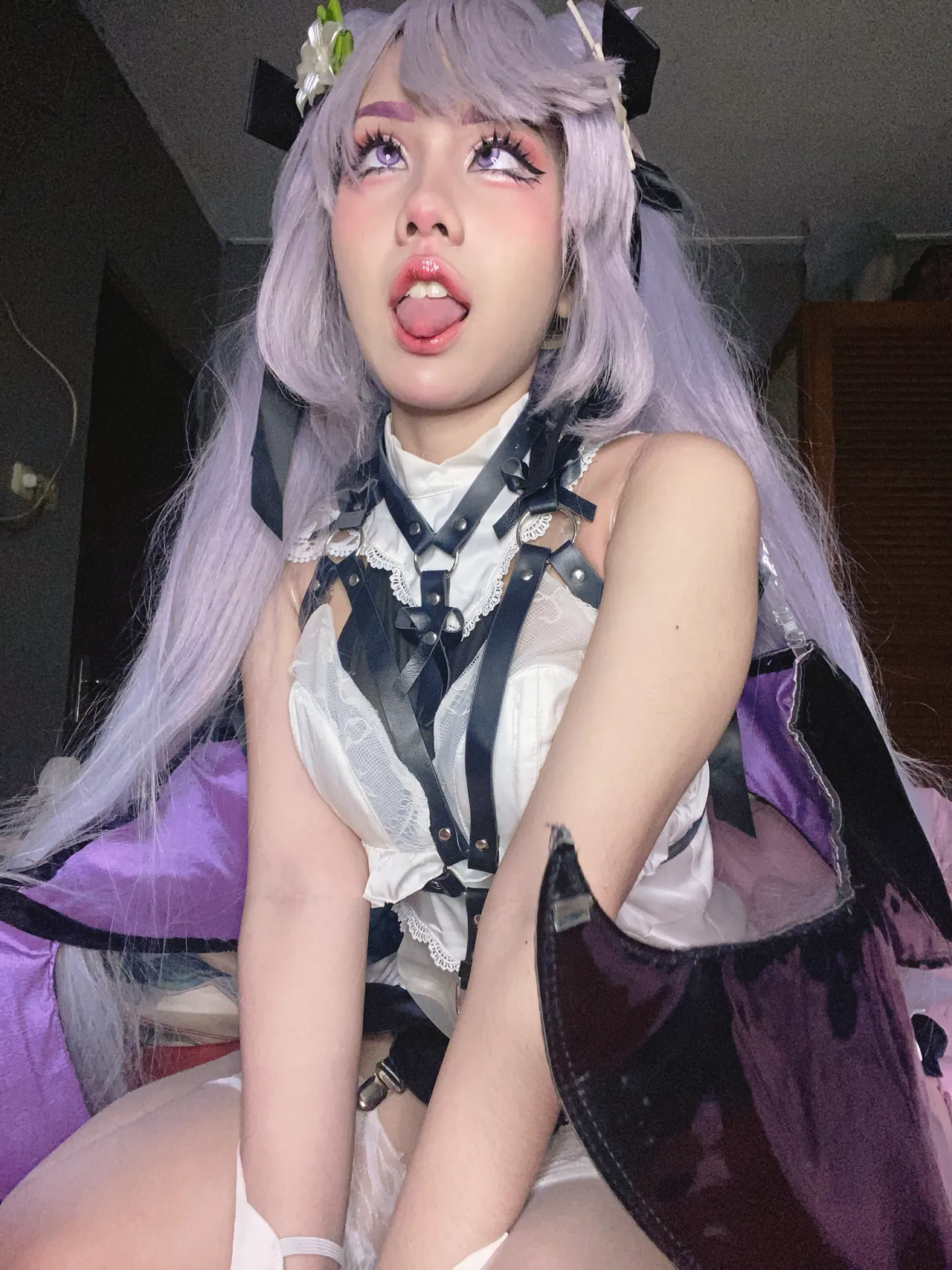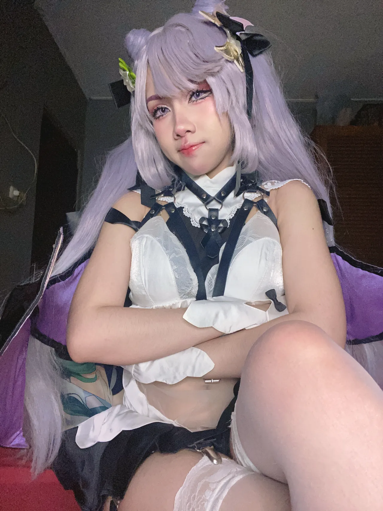 Tags: Genshin Impact, gloves, hair buns, harness, hentai cosplay, Keqing, Makeup, stockings, very long hair, wings