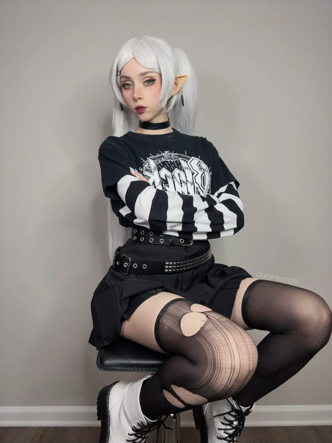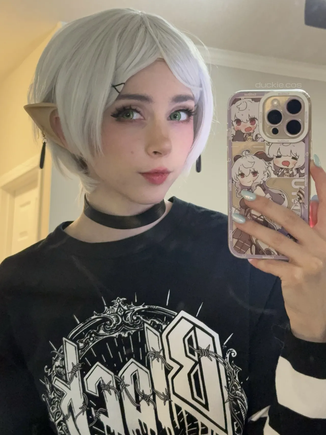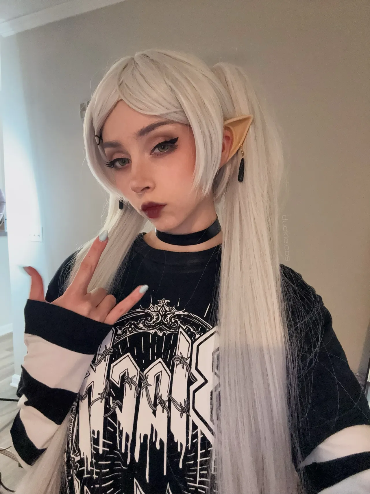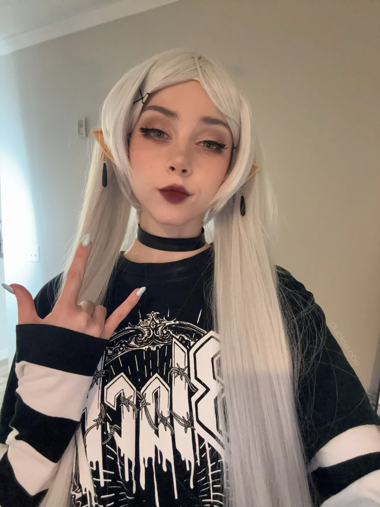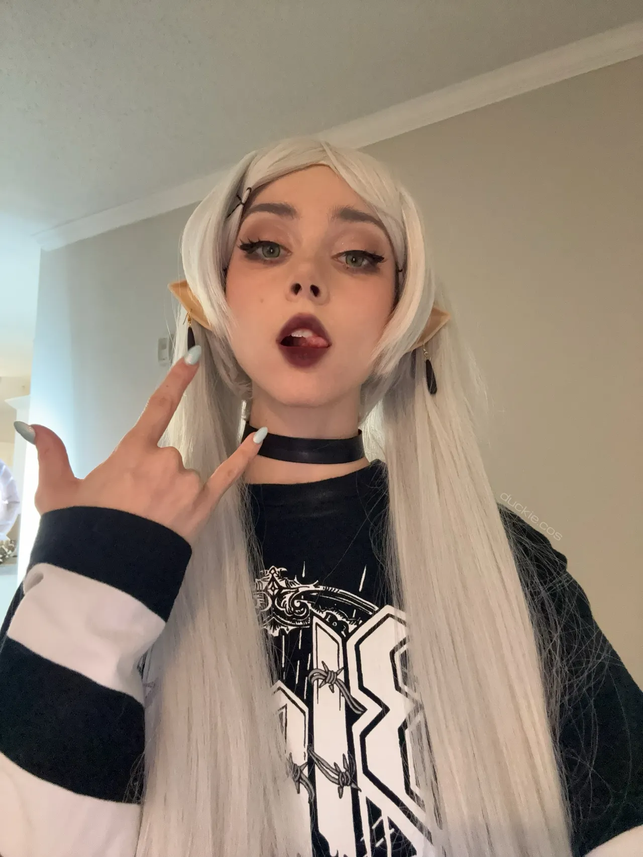 Tags: collar, elf, filming, frieren, hentai cosplay, Makeup, painted nails, sousou no frieren | frieren beyond journeys end, stockings, twintails, very long hair