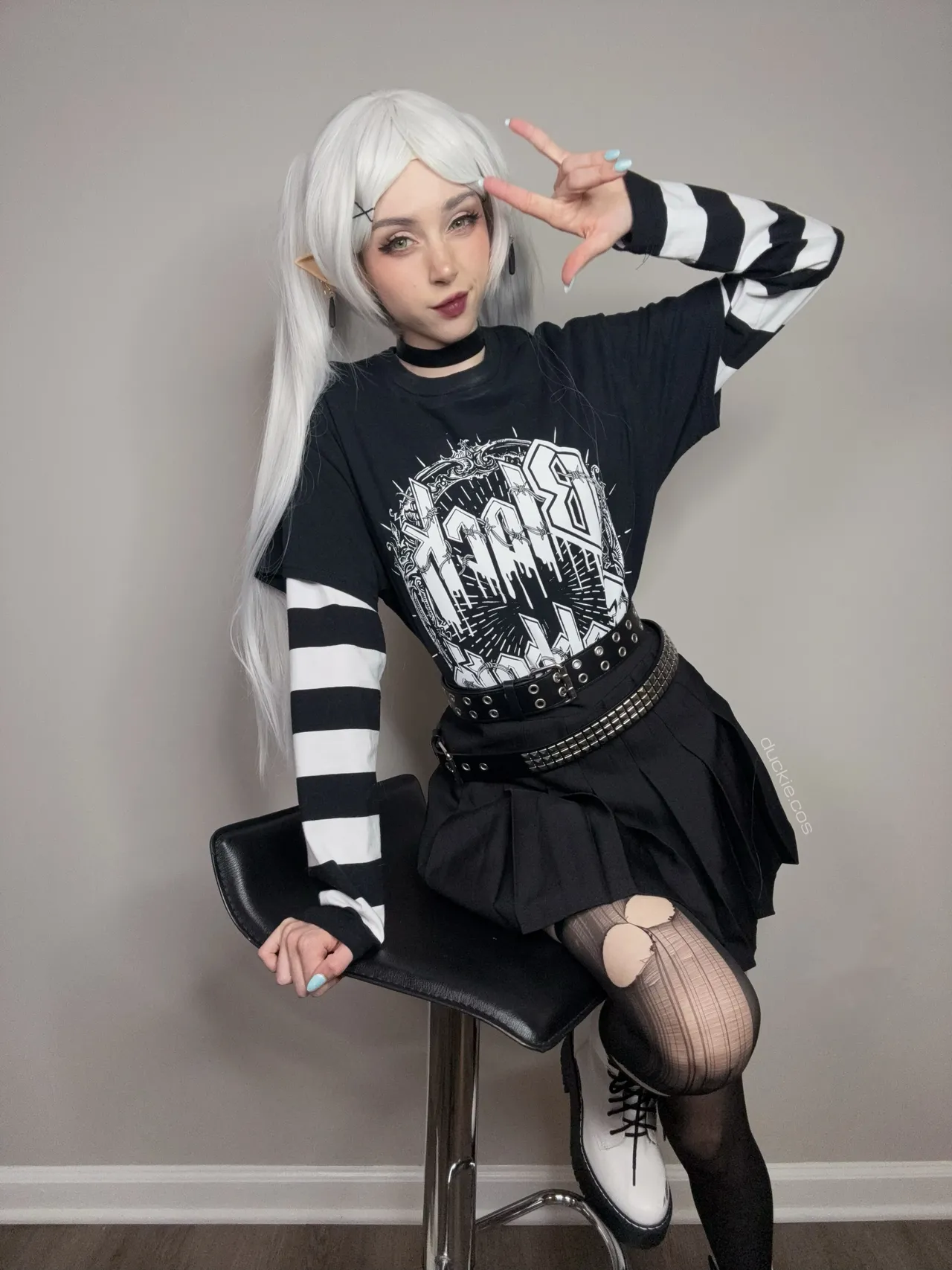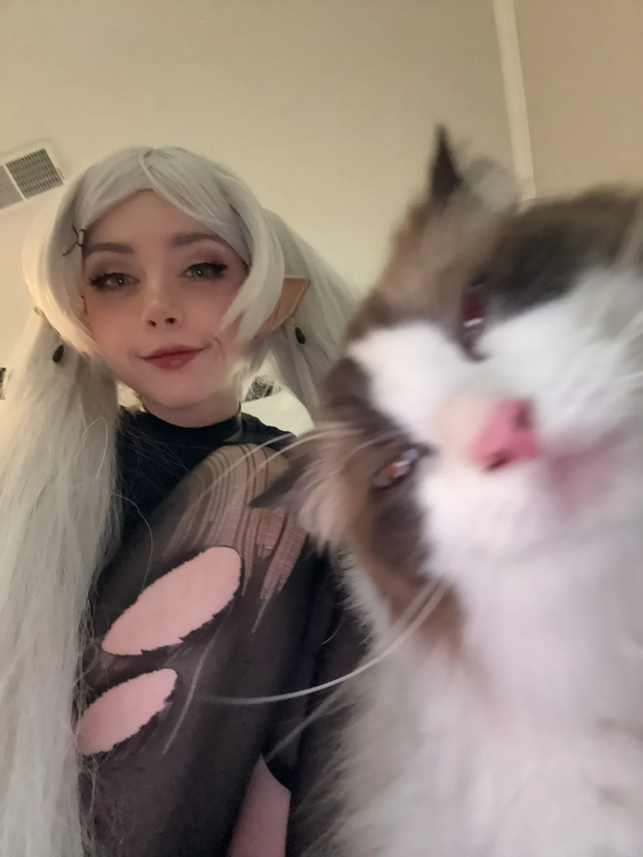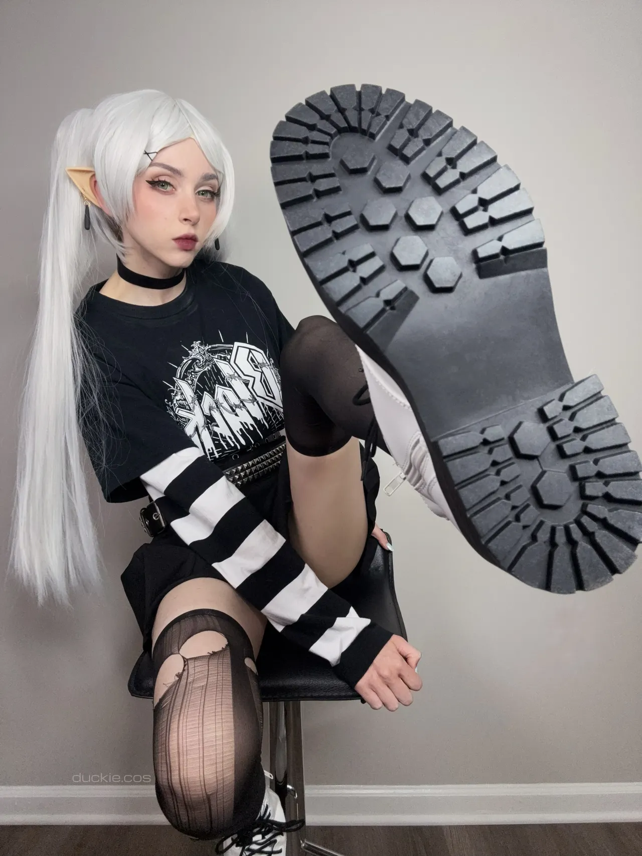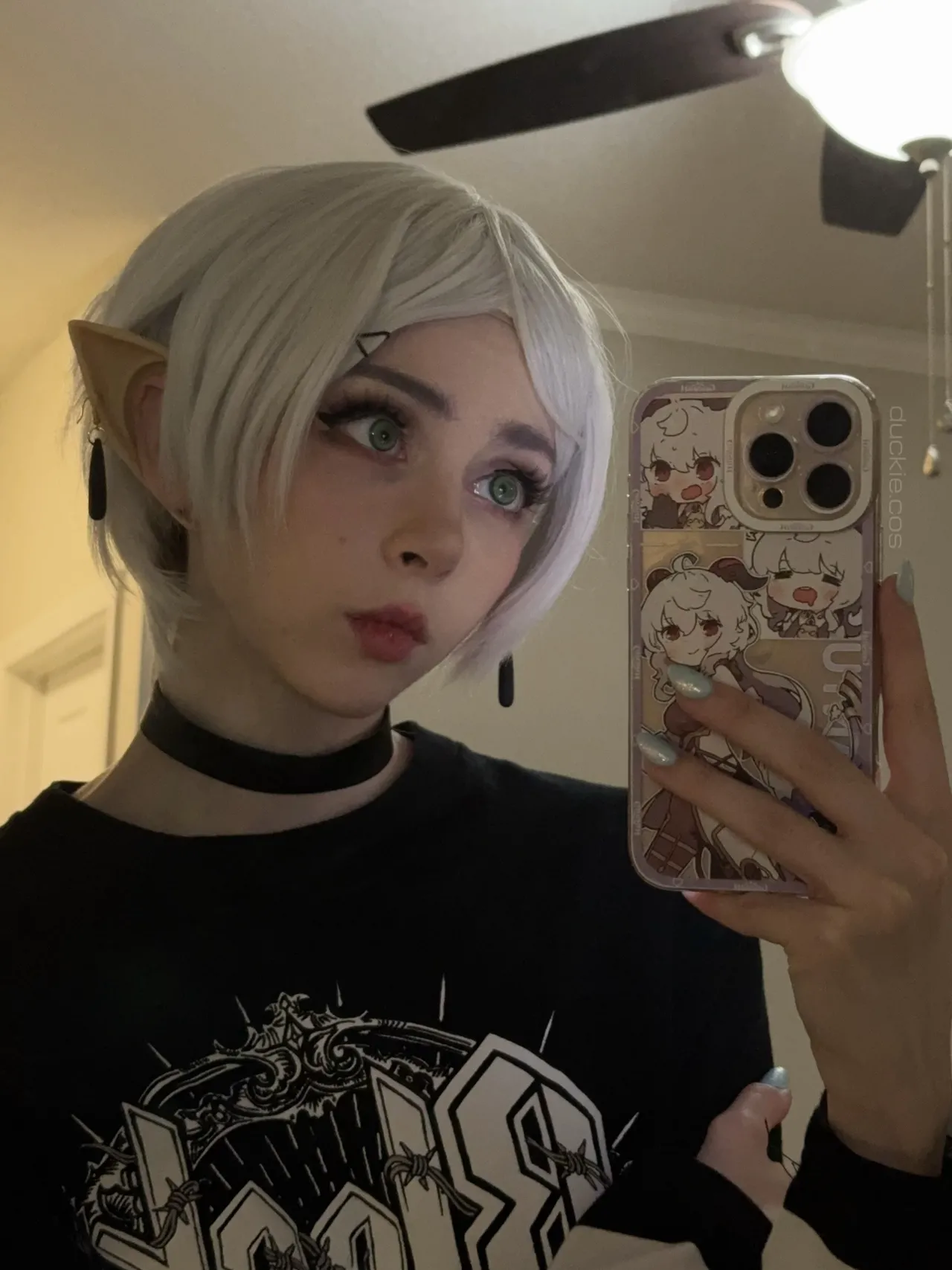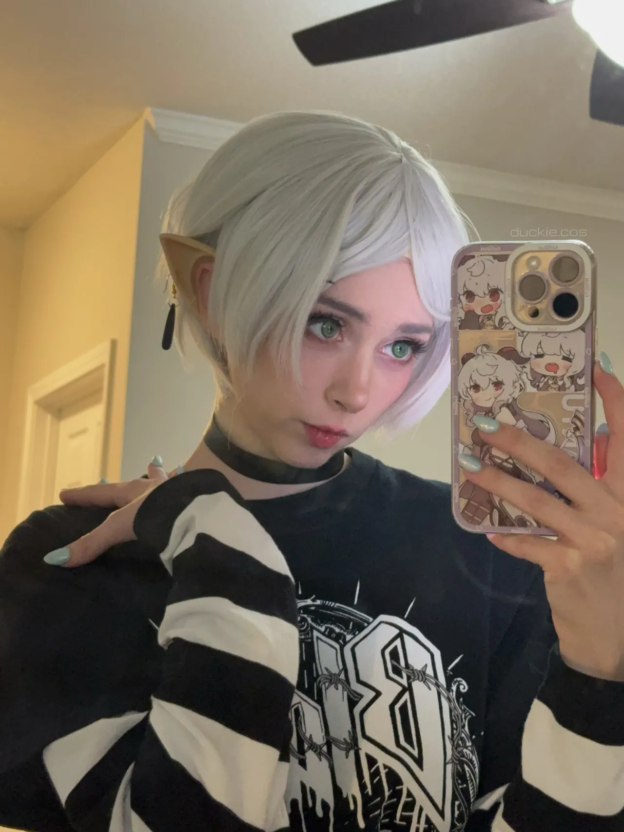 Tags: collar, elf, filming, frieren, hentai cosplay, Makeup, painted nails, sousou no frieren | frieren beyond journeys end, stockings, twintails, very long hair