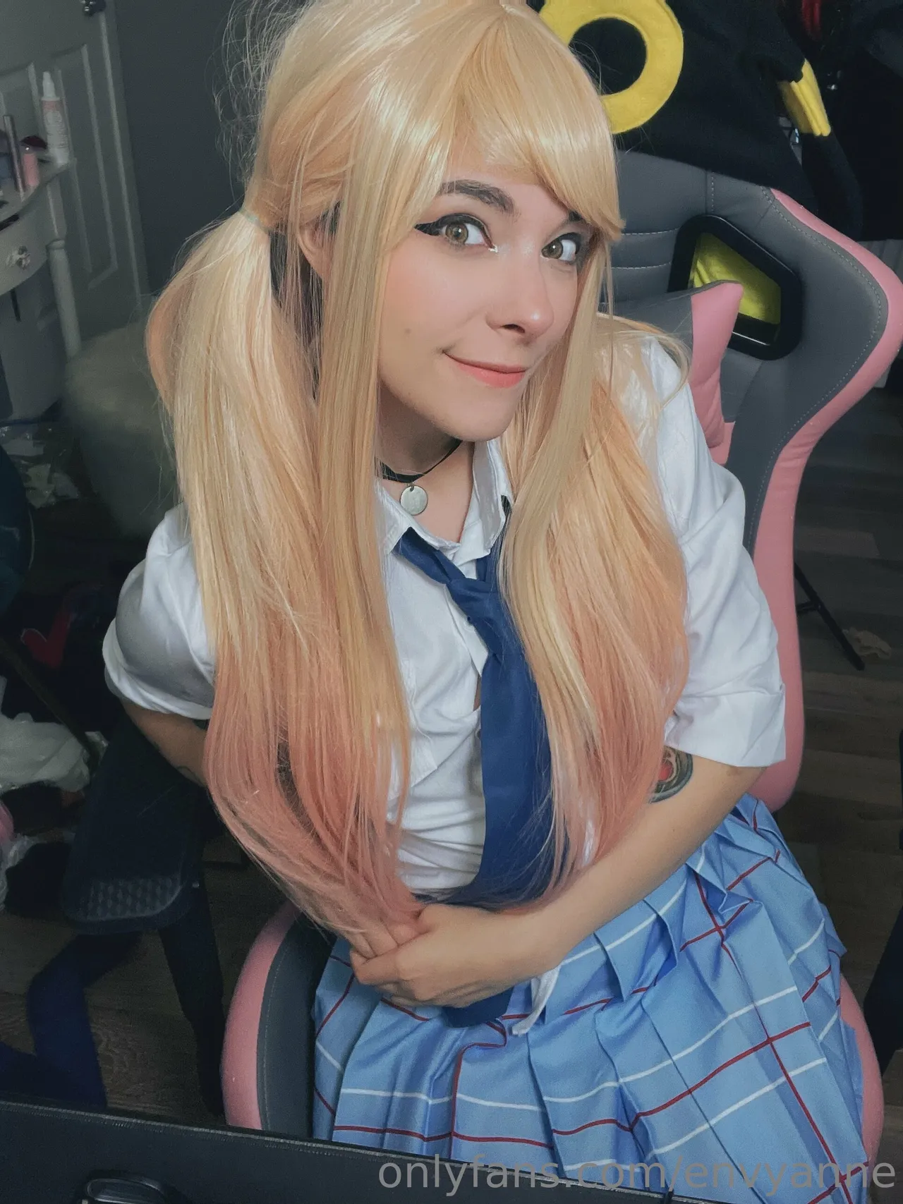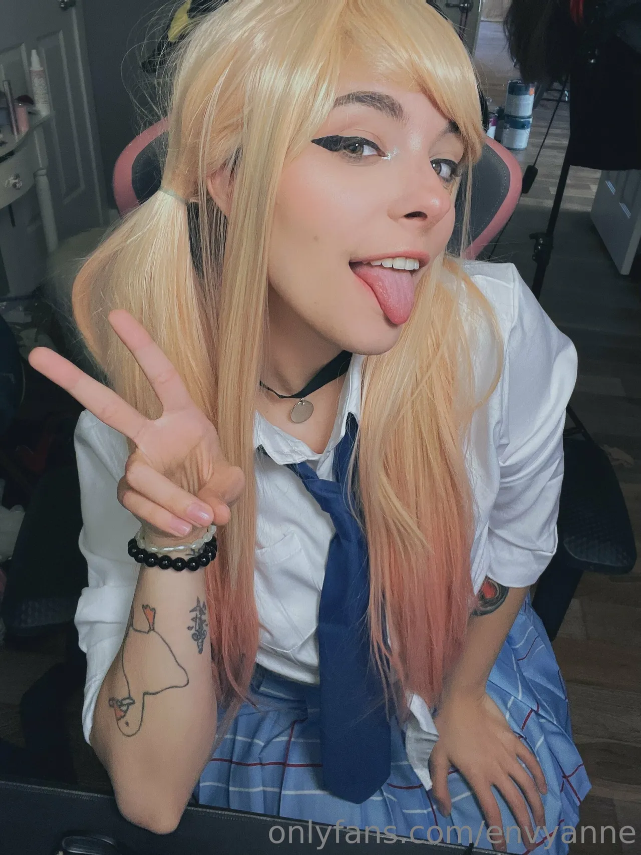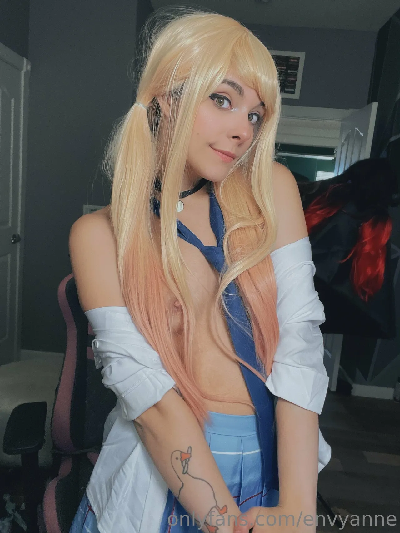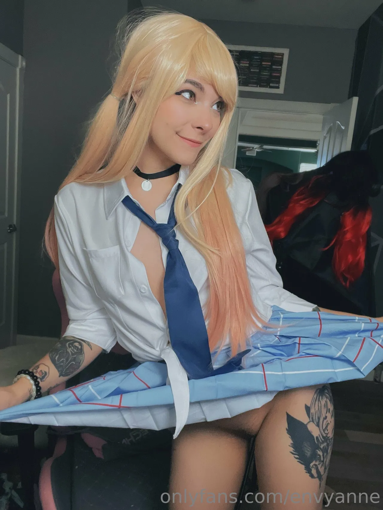 Tags: collar, gyaru, hentai cosplay, large tattoo, Makeup, Marin Kitagawa, pubic stubble, schoolgirl uniform, sole female, sono bisque doll wa koi o suru | my dress-up darling, twintails, very long hair