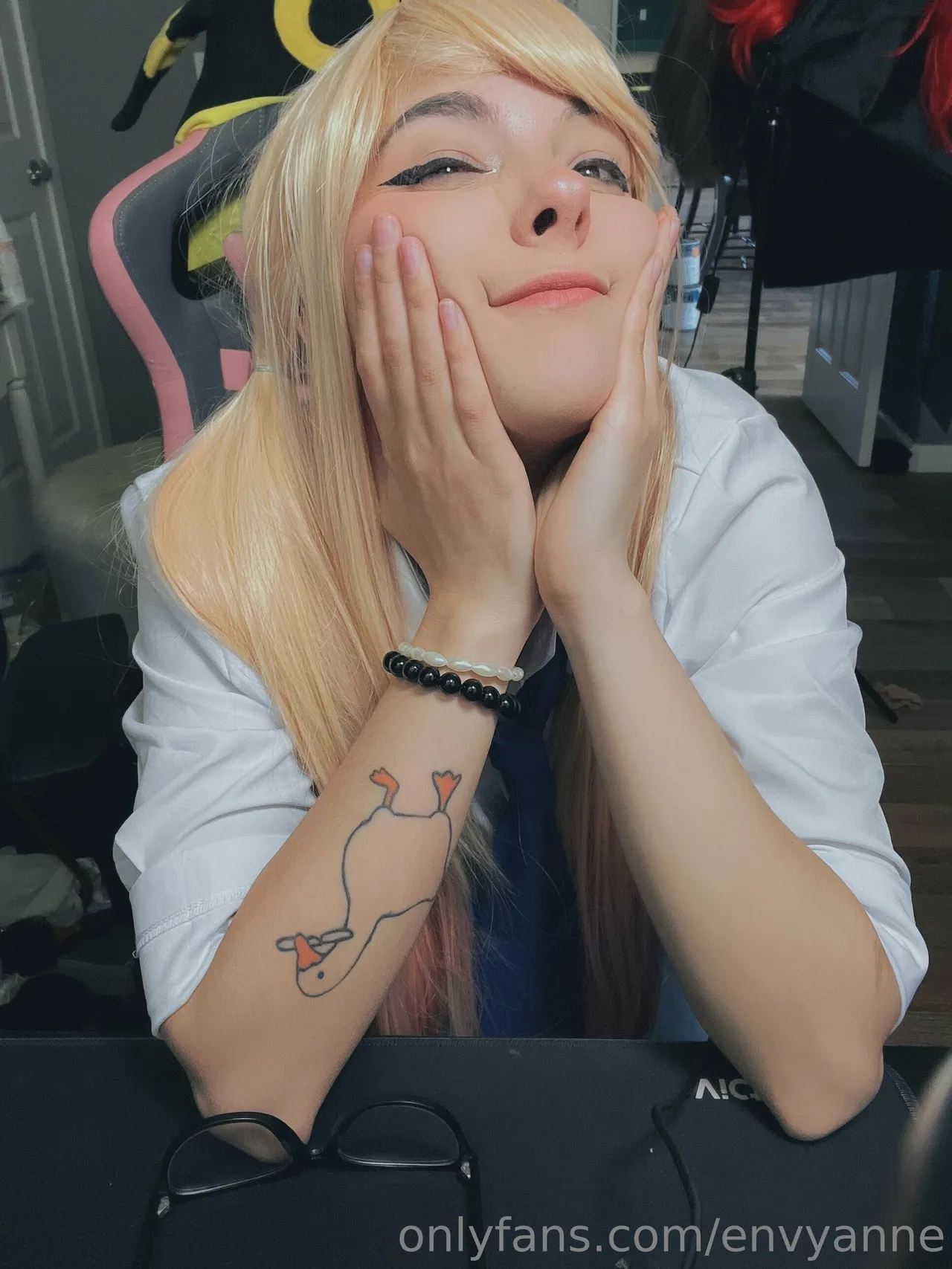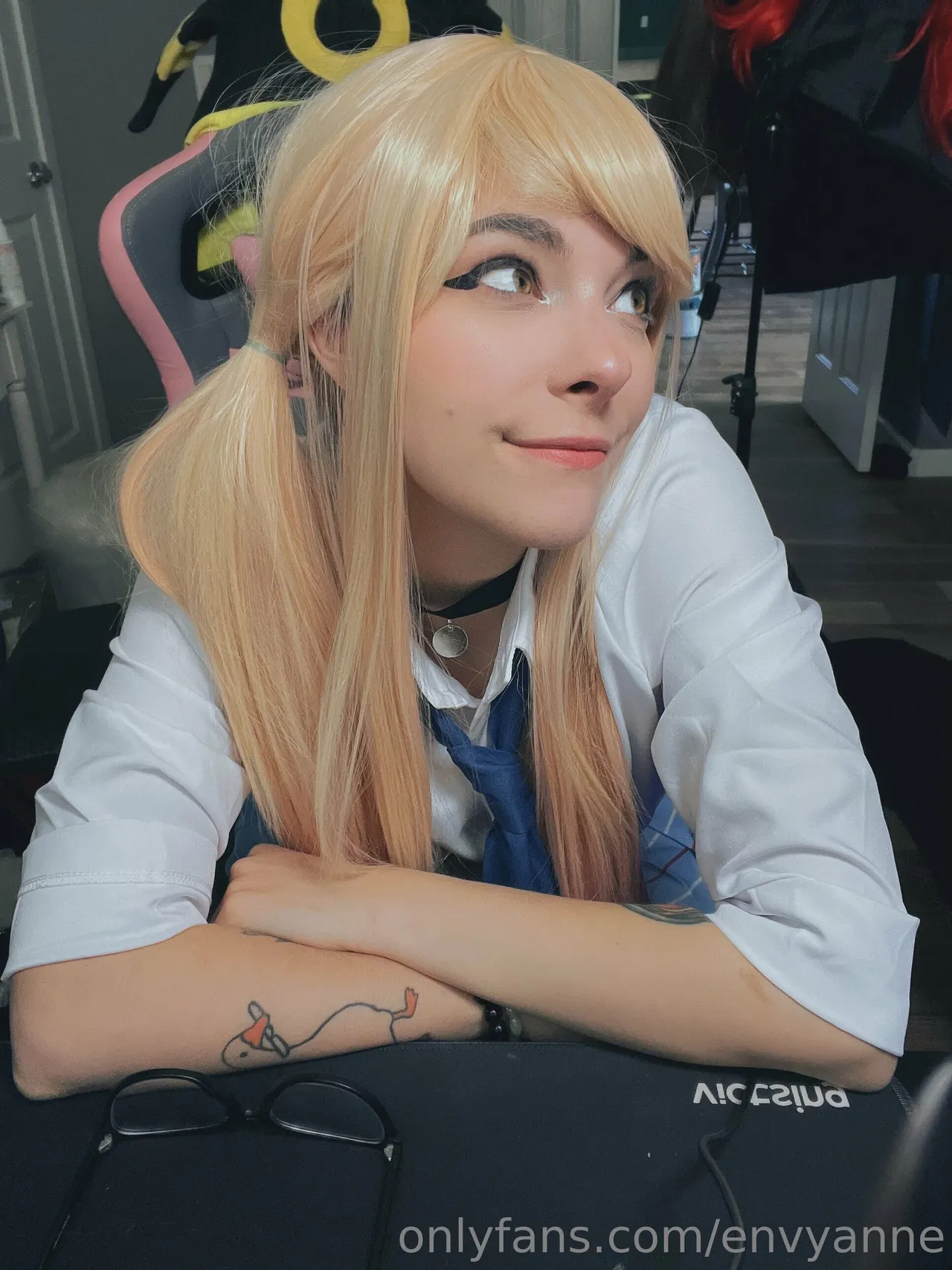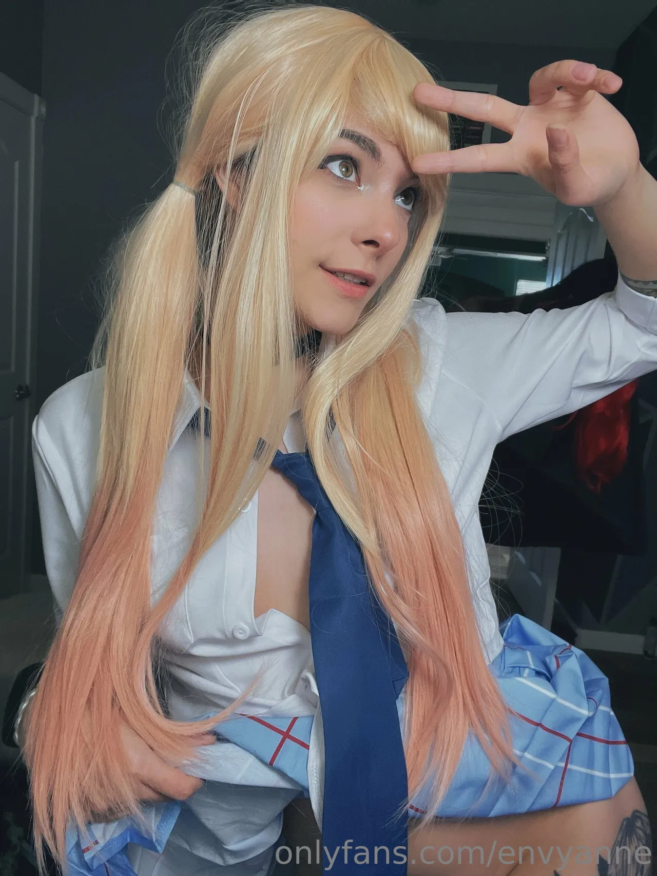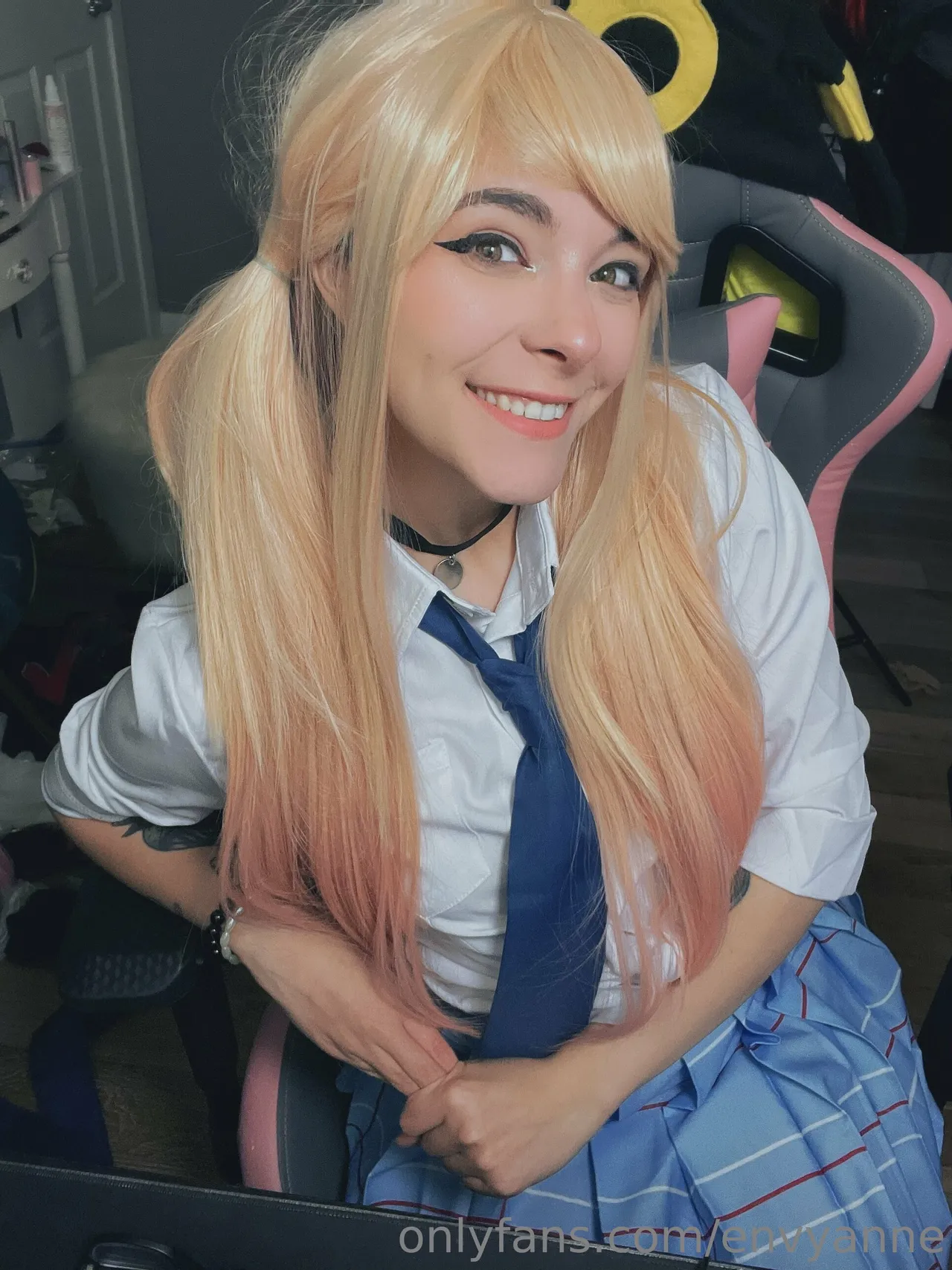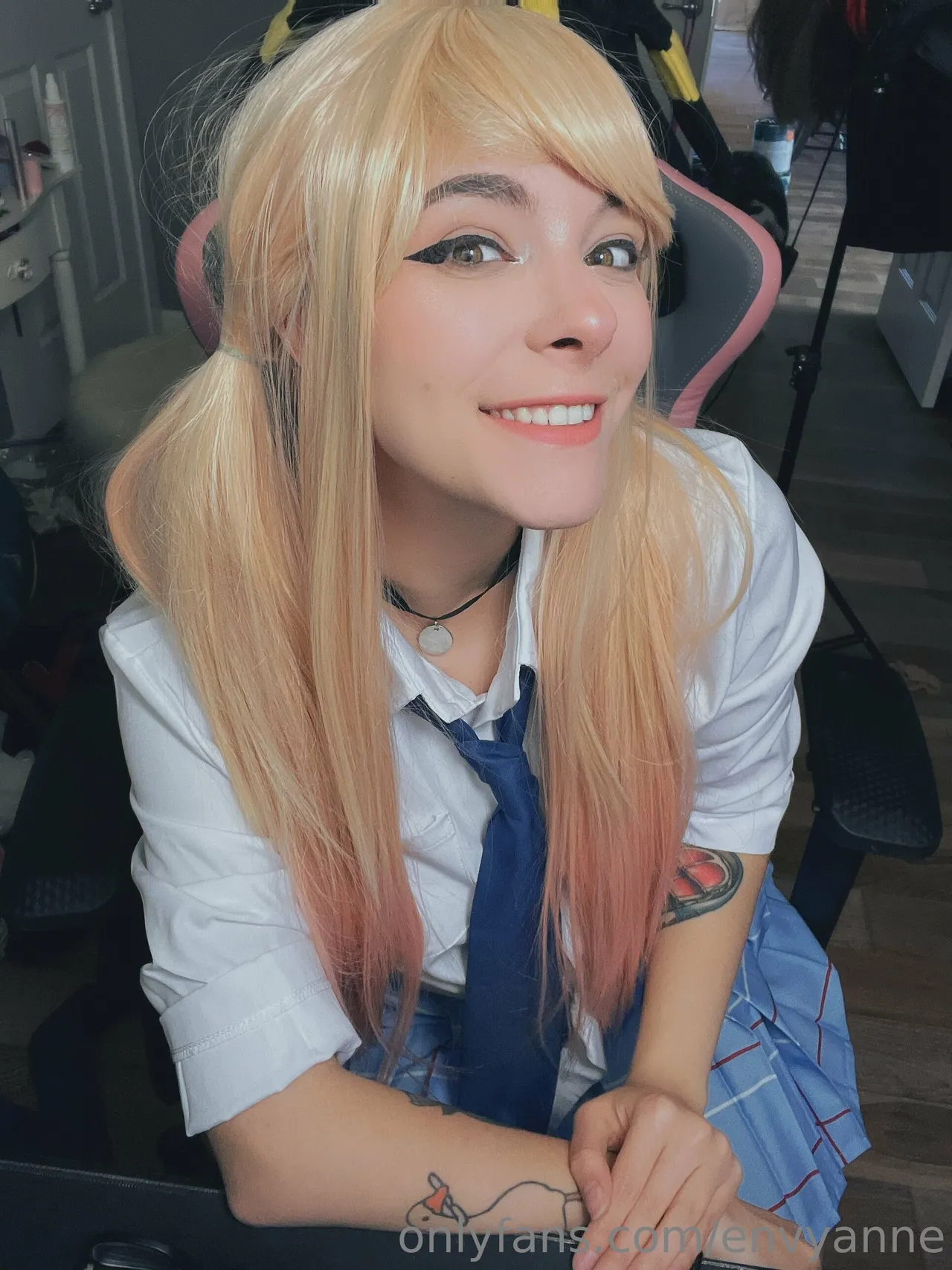Tags: collar, gyaru, hentai cosplay, large tattoo, Makeup, Marin Kitagawa, pubic stubble, schoolgirl uniform, sole female, sono bisque doll wa koi o suru | my dress-up darling, twintails, very long hair