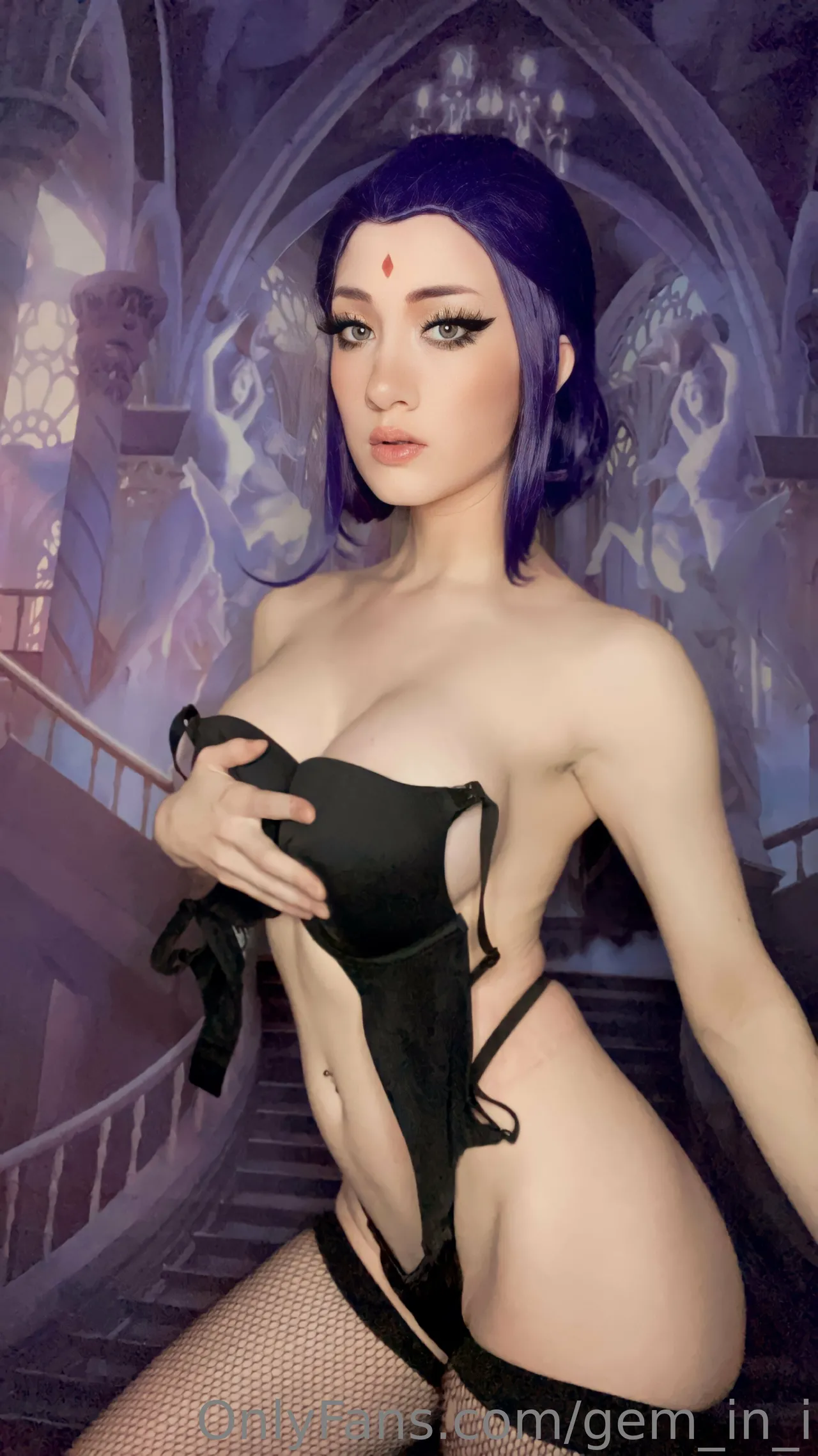 Tags: big breasts, fishnets, hentai cosplay, lingerie, Makeup, Raven, sole female, stockings, teen titans, thigh high boots