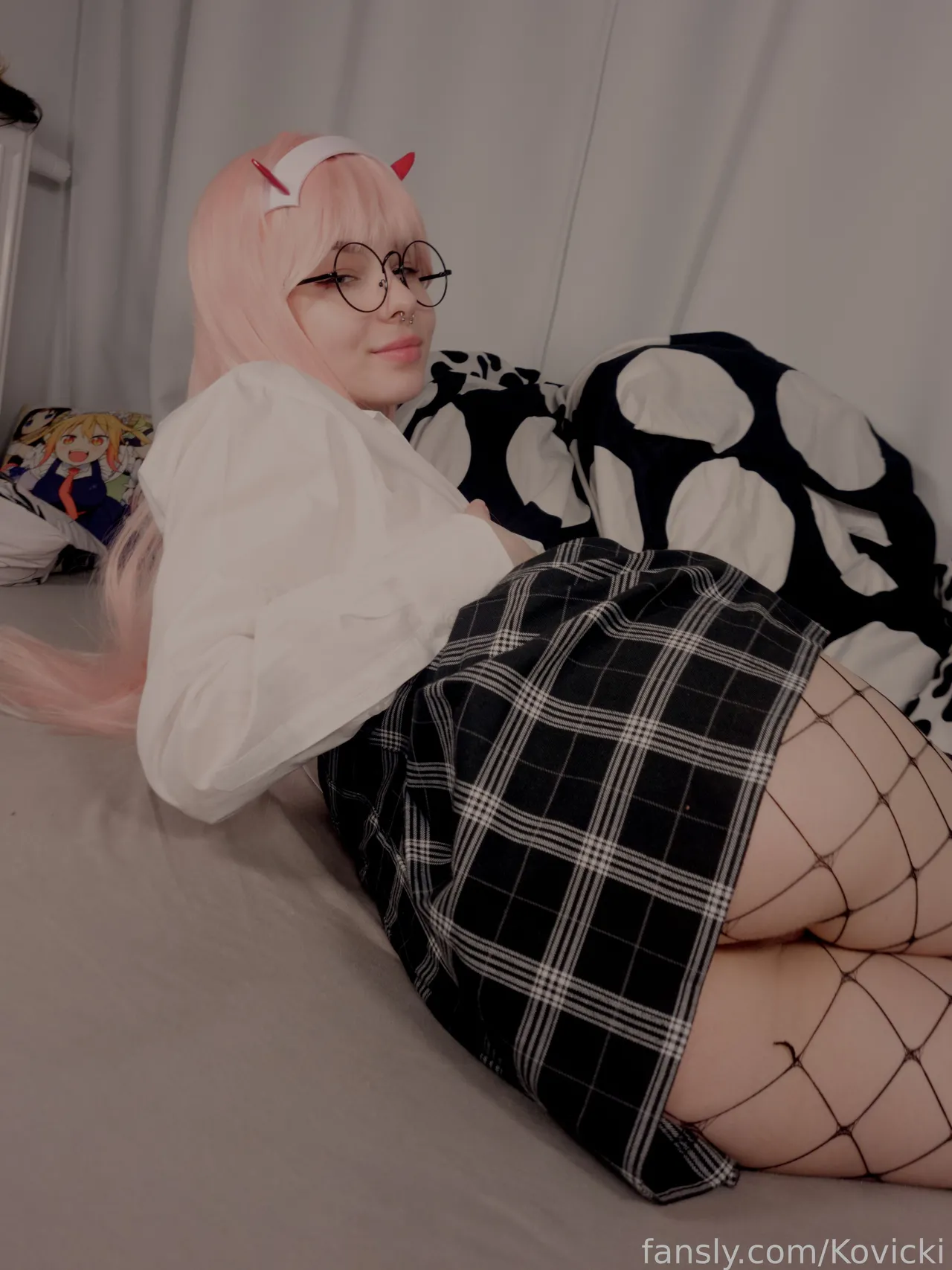 Tags: Darling in the Franxx, fishnets, Glasses, hentai cosplay, horns, Makeup, pantyhose, piercing, sole female, Zero Two