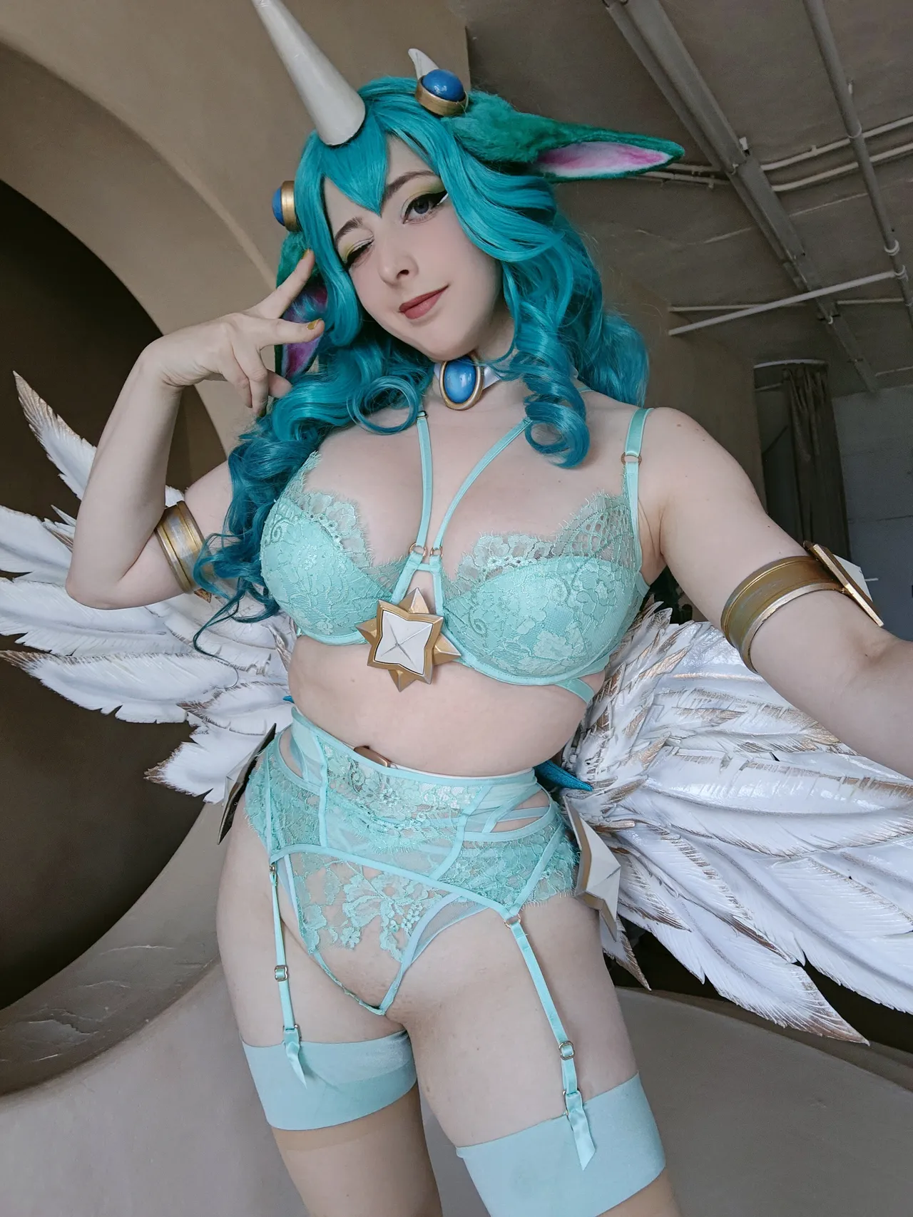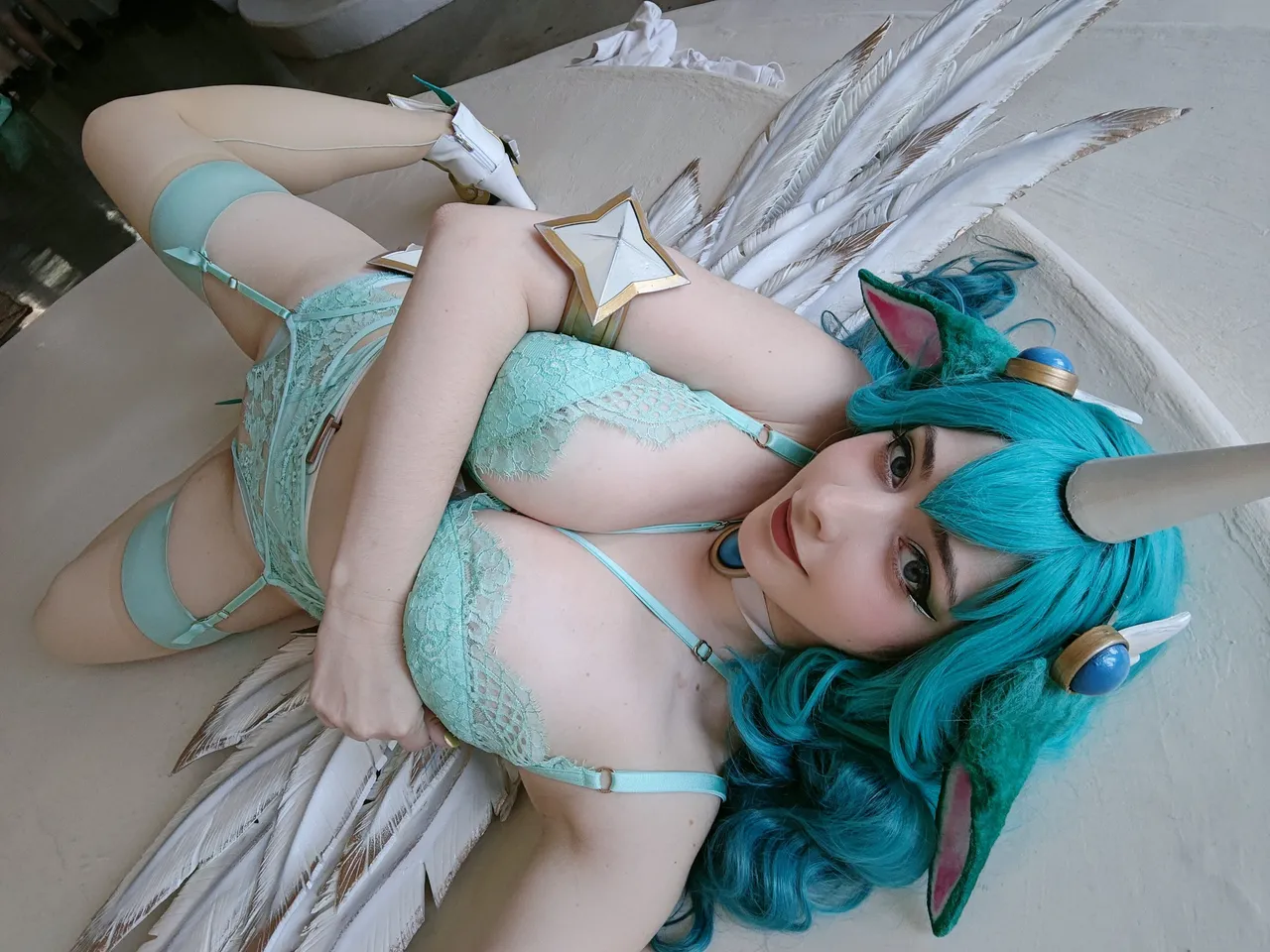 Tags: big breasts, collar, garter belt, hentai cosplay, horns, Kemonomimi, League Of Legends, lingerie, Makeup, painted nails, Soraka, stockings, wings