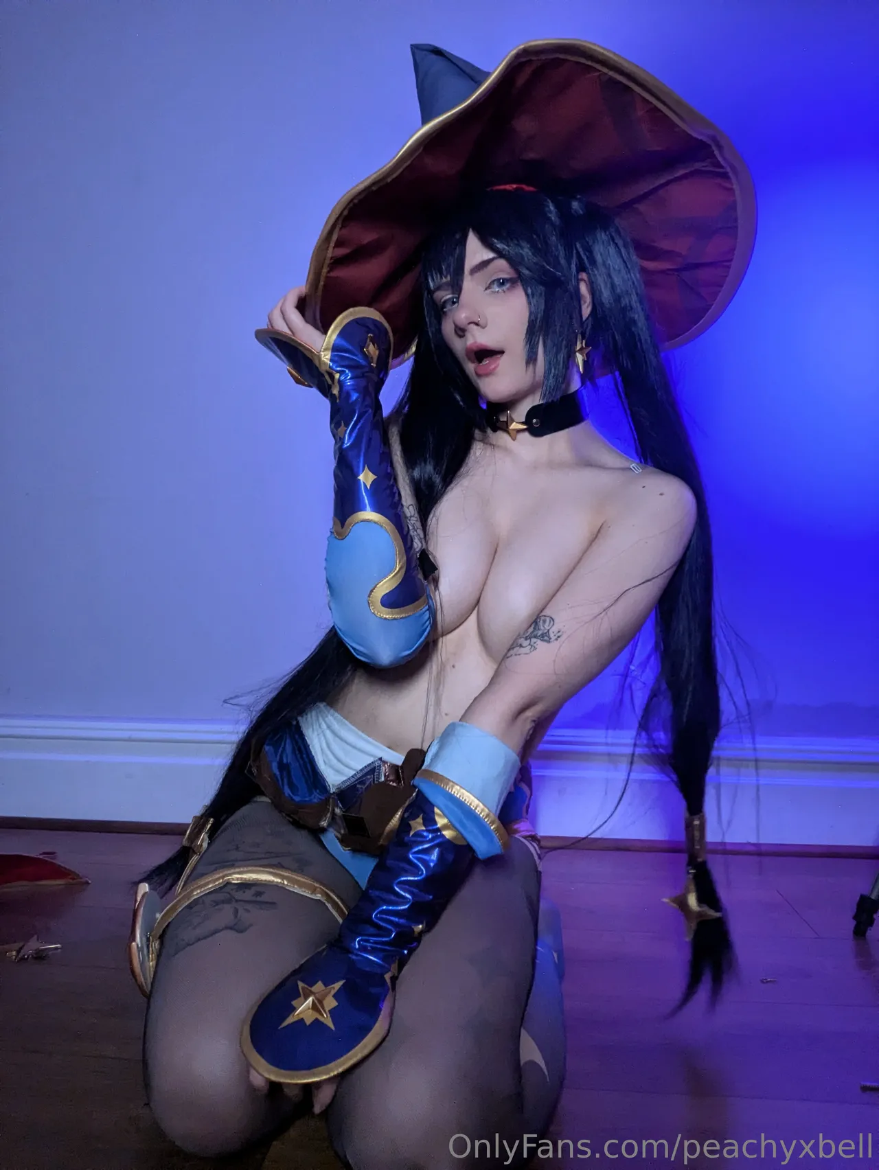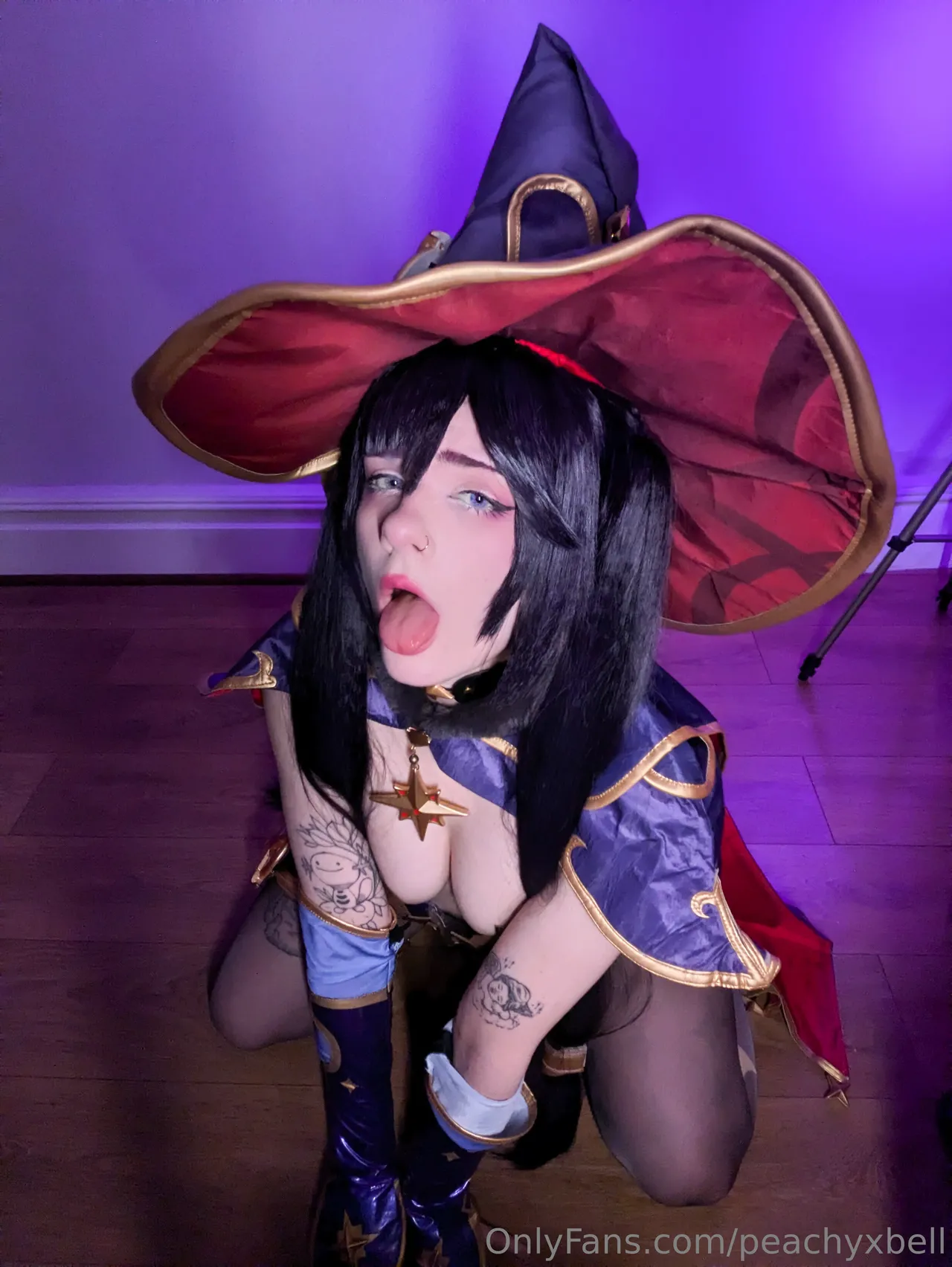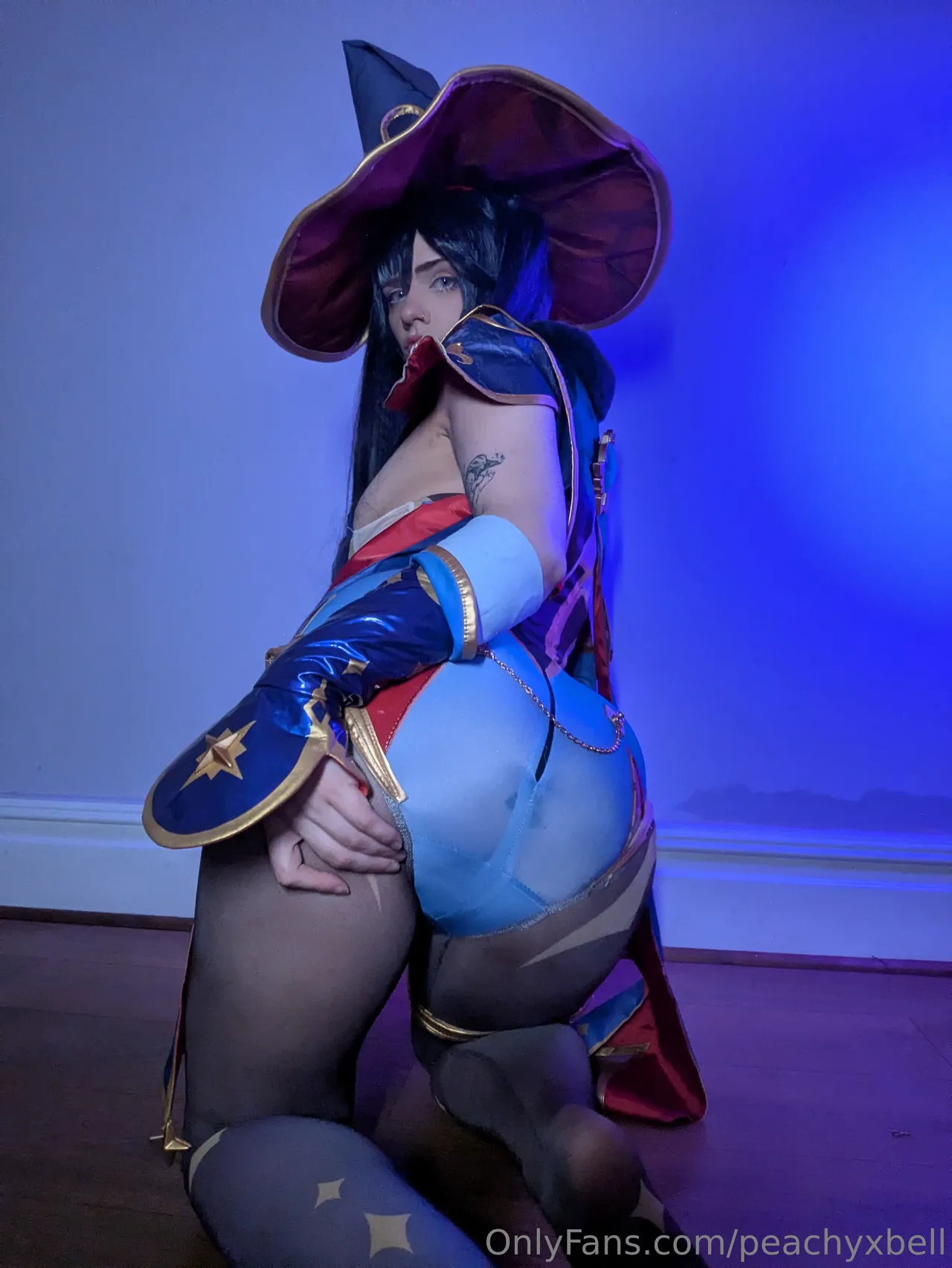 Tags: Genshin Impact, hentai cosplay, large tattoo, Mona, mona megistus, pasties, piercing, stockings, twintails