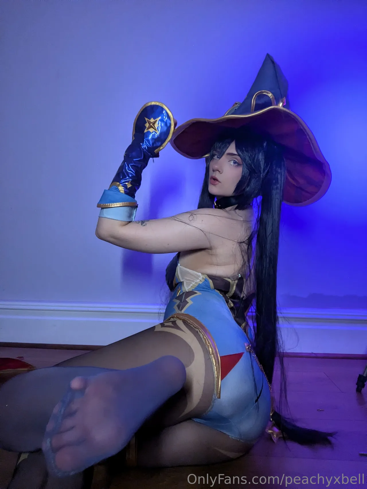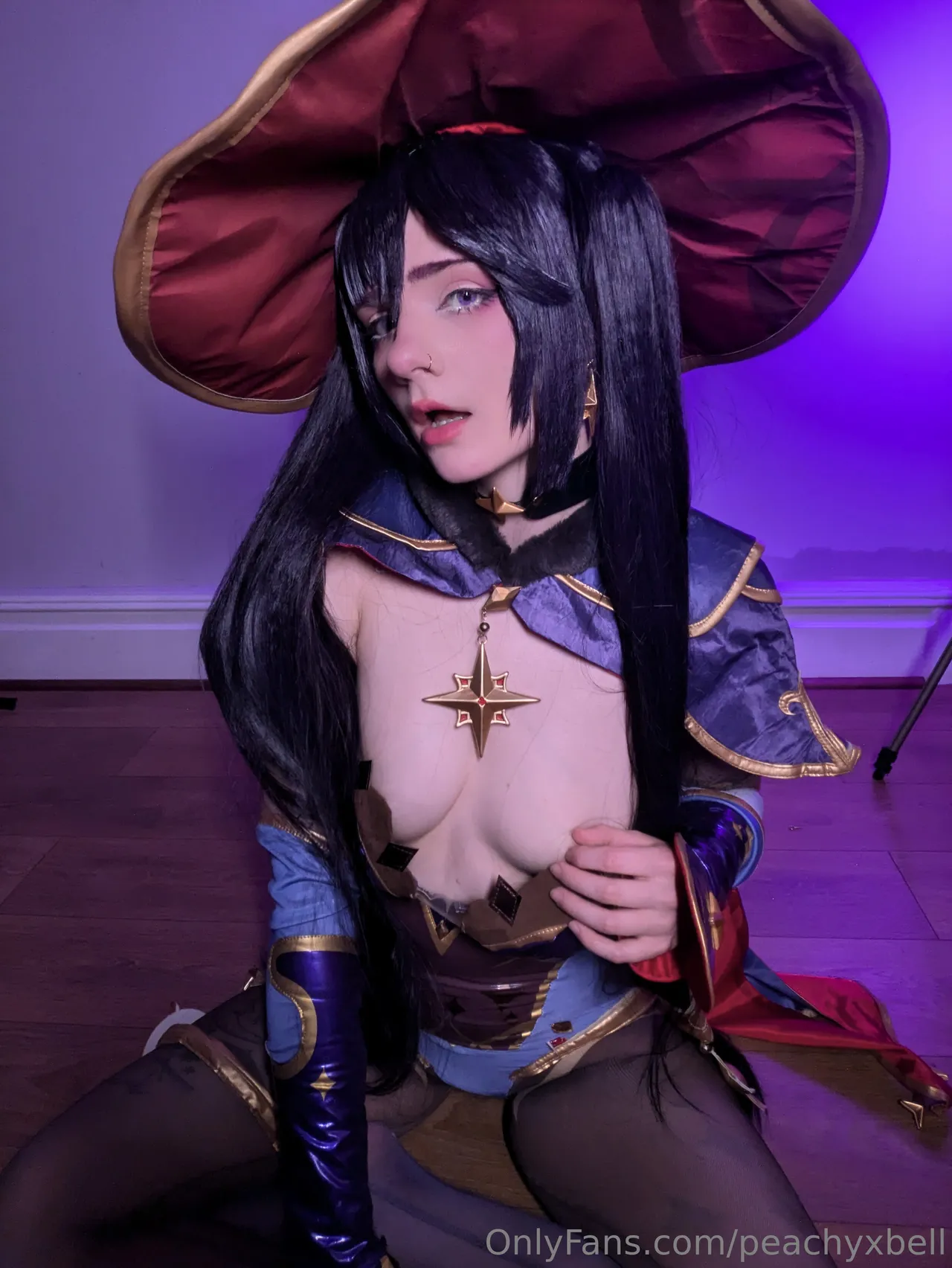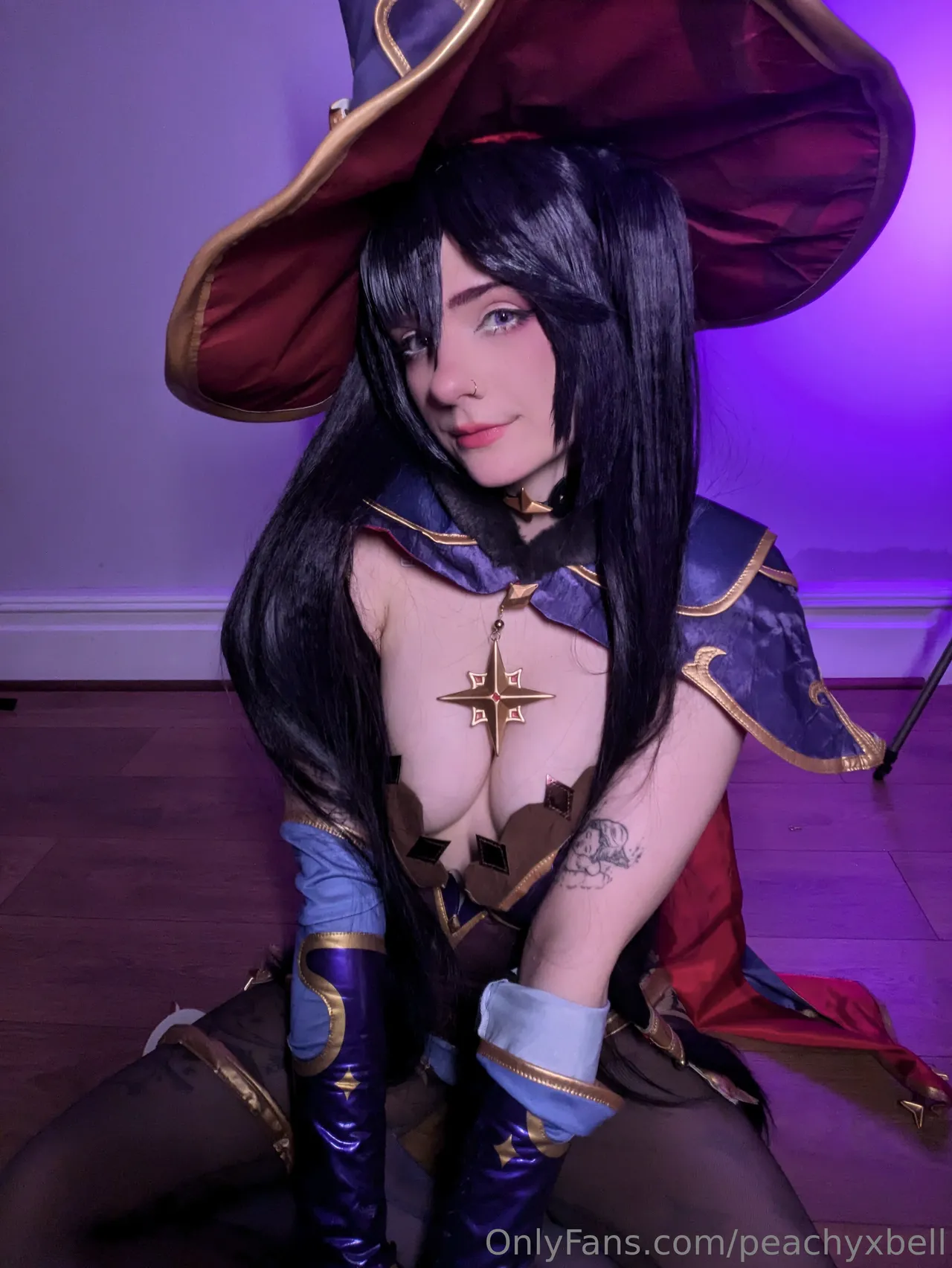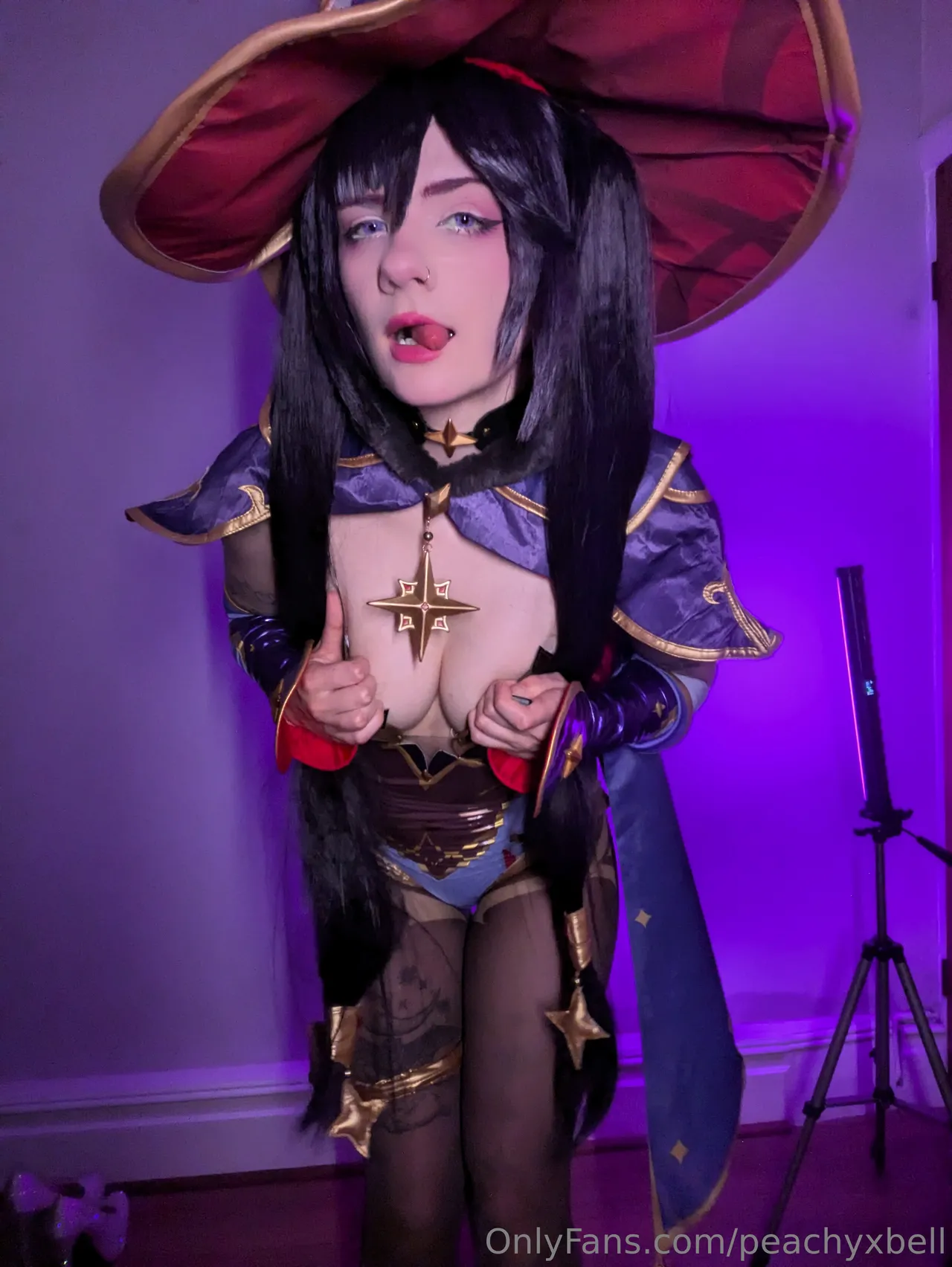 Tags: Genshin Impact, hentai cosplay, large tattoo, Mona, mona megistus, pasties, piercing, stockings, twintails