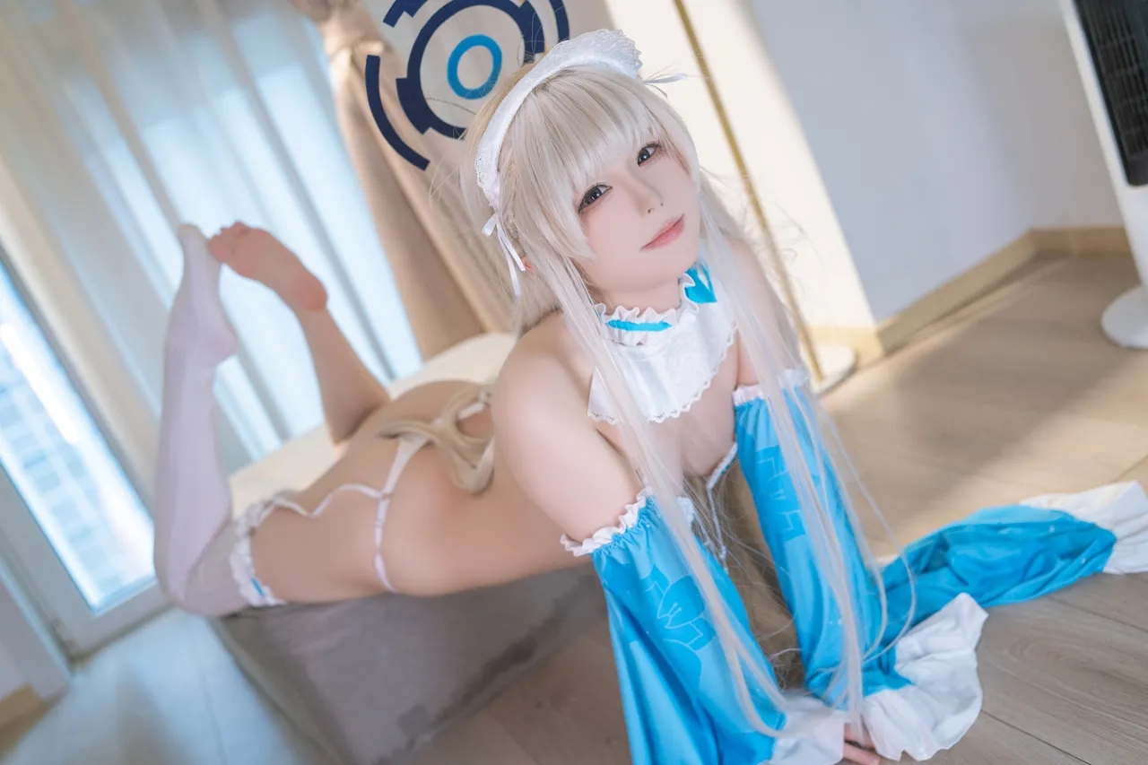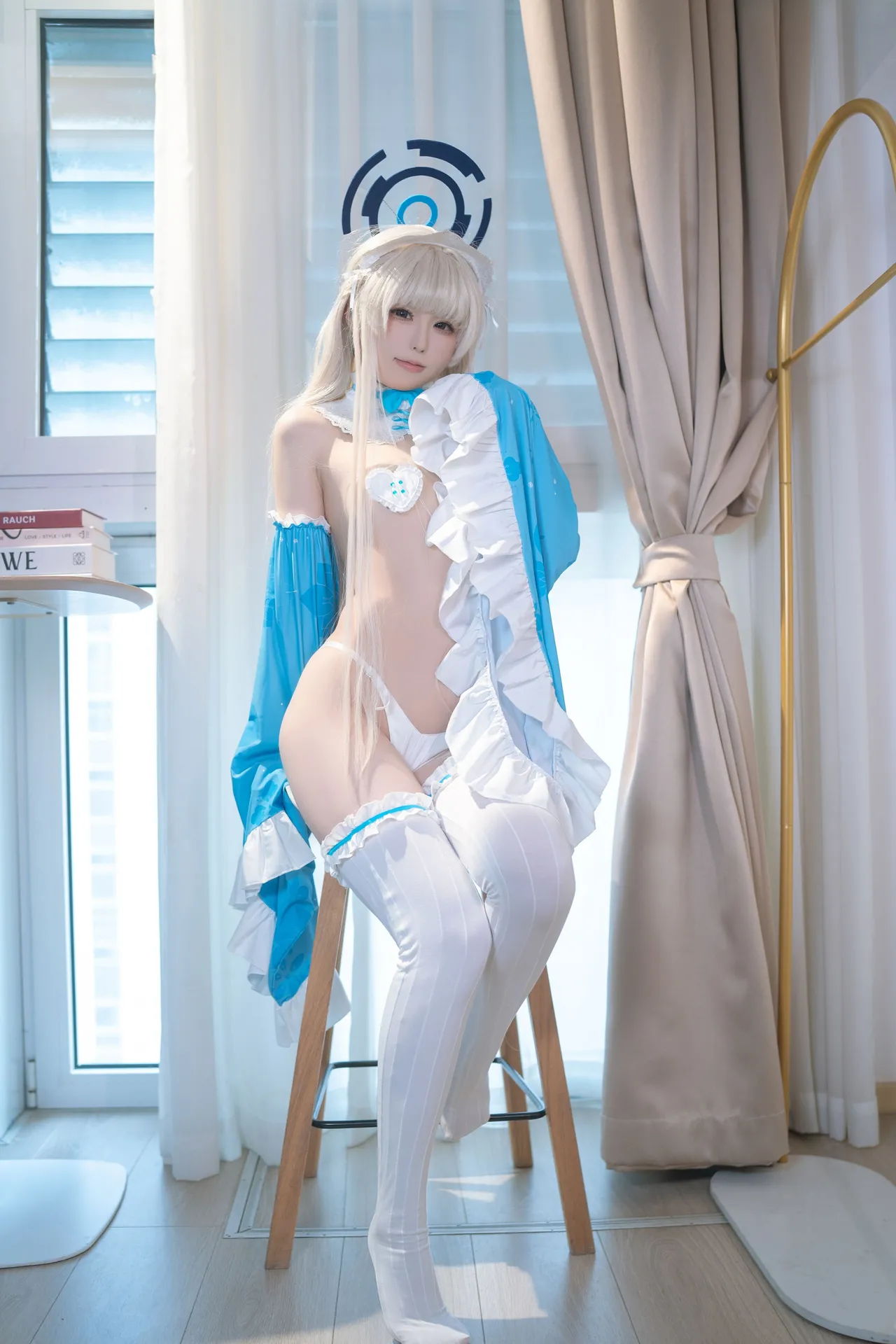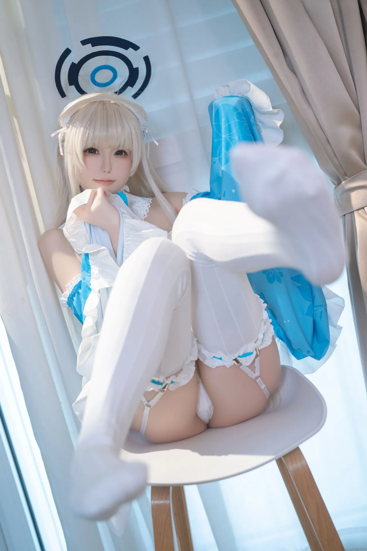 Tags: Blue Archive, detached sleeves, garter belt, Halo, hentai cosplay, Makeup, stockings, toki asuma, very long hair