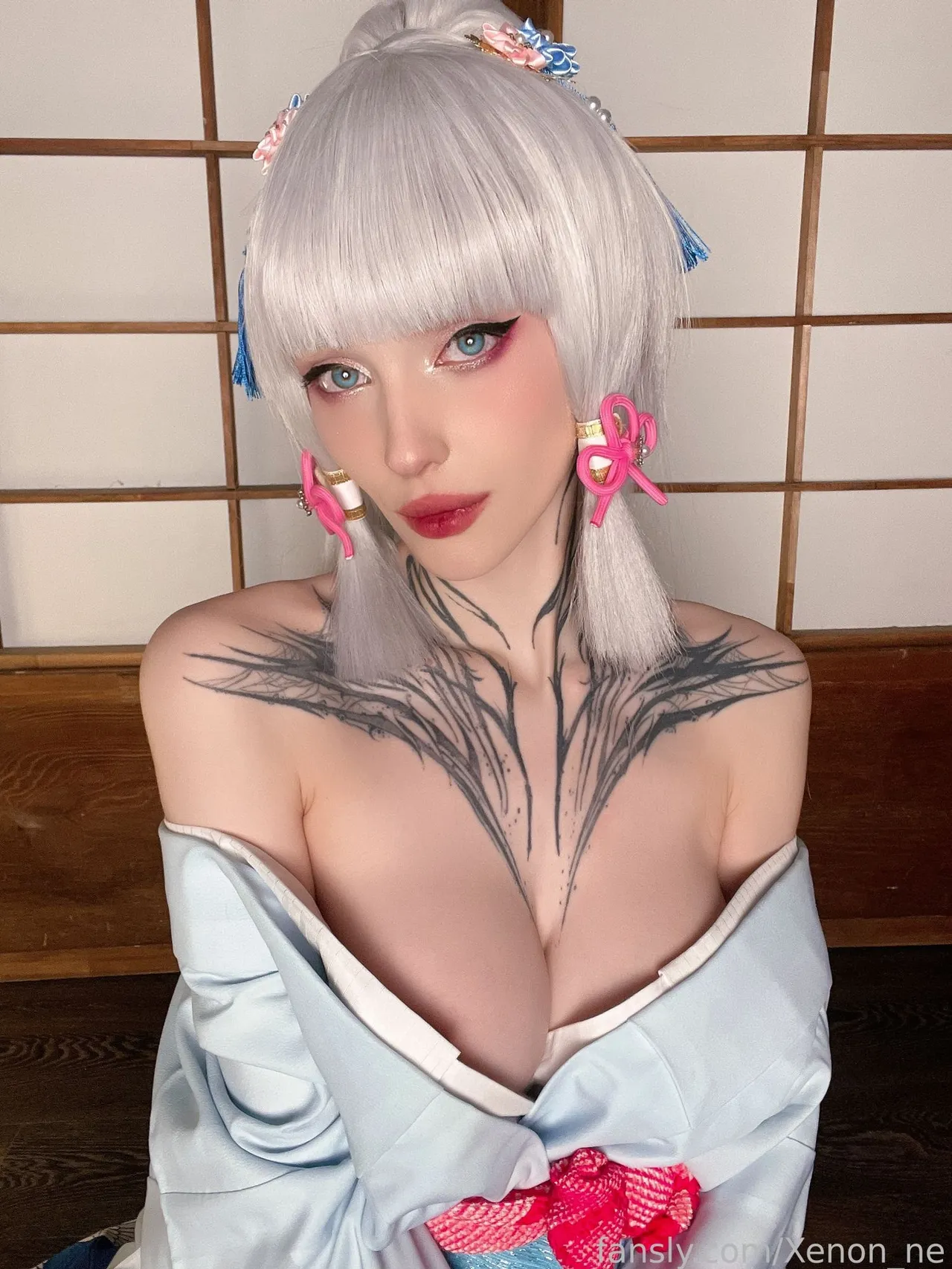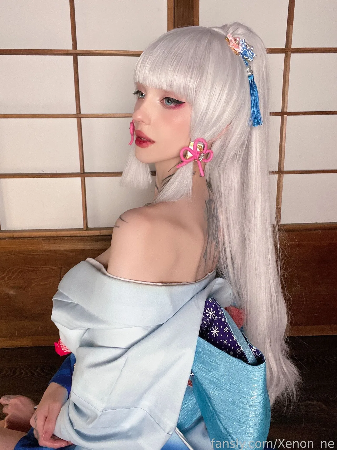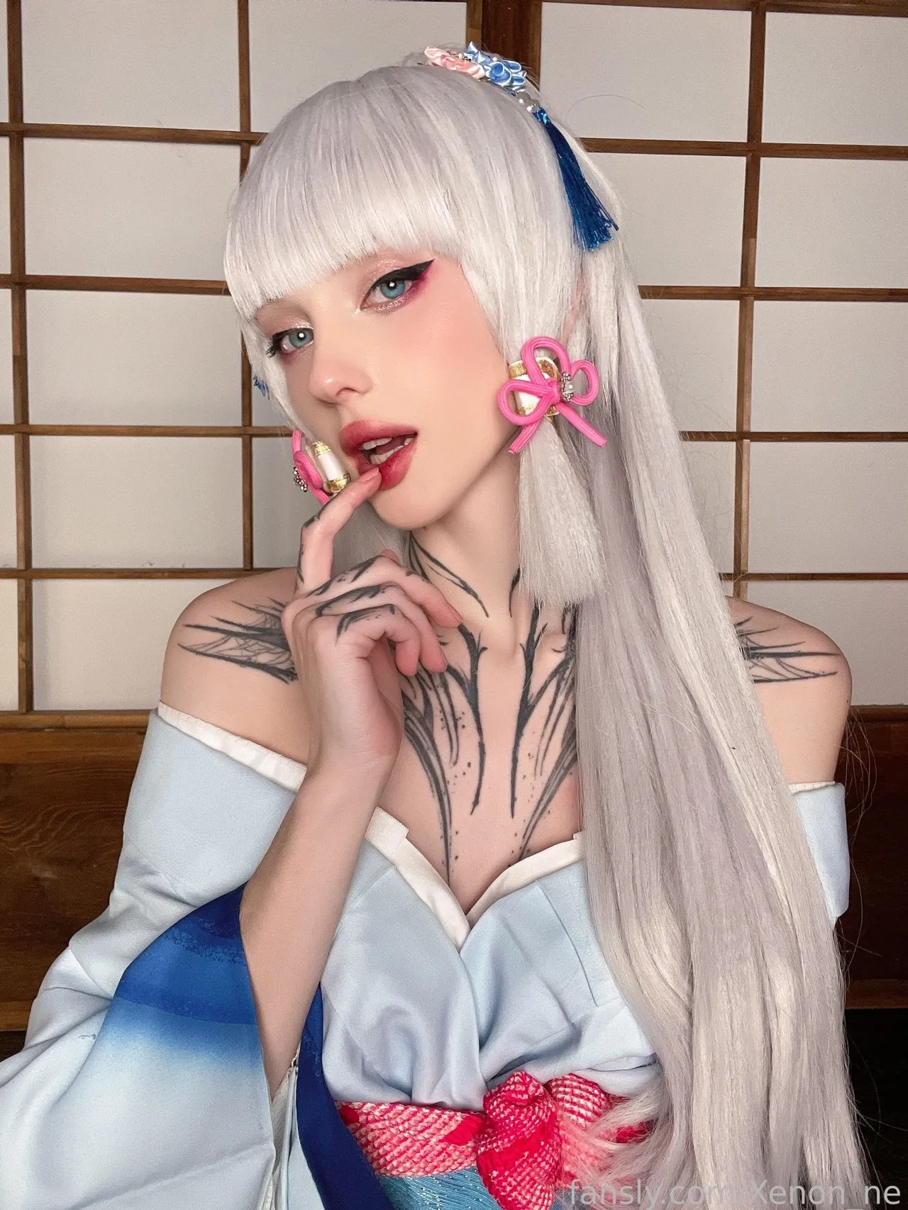 Tags: ayaka kamisato, Genshin Impact, hentai cosplay, Kimono, large tattoo, Makeup, painted nails, very long hair